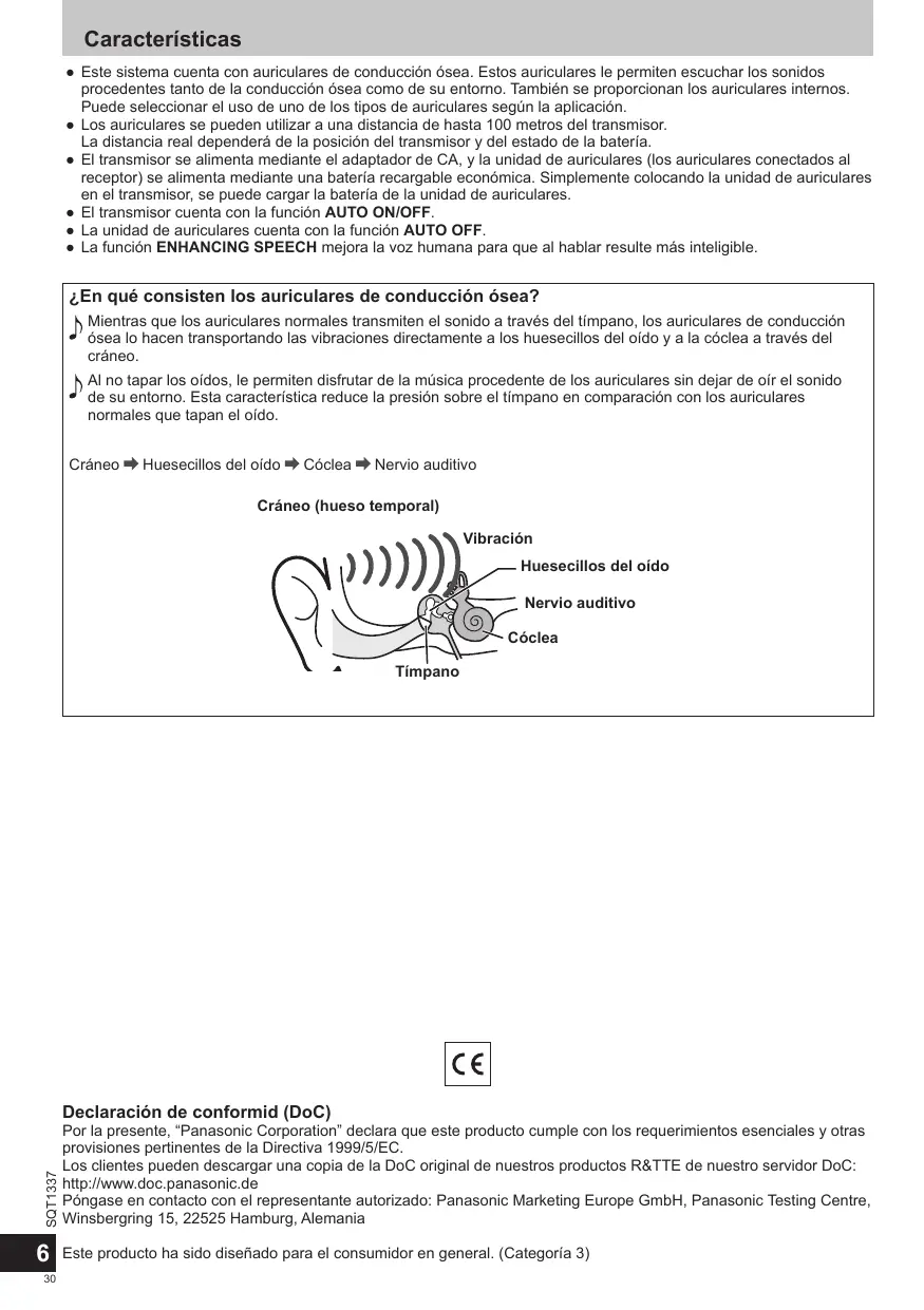 Características ● Este sistema cuenta con auriculares de conducción ósea. Estos auriculares le permiten escuchar los sonidos procedentes tanto de la conducción ósea como de su entorno. También se proporcionan los auriculares internos. Puede seleccionar el uso de uno de los tipos de auriculares según la aplicación. ● Los auriculares se pueden utilizar a una distancia de hasta 100 metros del transmisor. La distancia real dependerá de la posición del transmisor y del estado de la batería. ● El transmisor se alimenta mediante el adaptador de CA, y la unidad de auriculares (los auriculares conectados al receptor) se alimenta mediante una batería recargable económica. Simplemente colocando la unidad de auriculares en el transmisor, se puede cargar la batería de la unidad de auriculares. ● El transmisor cuenta con la función AUTO ON/OFF. ● La unidad de auriculares cuenta con la función AUTO OFF. ● La función ENHANCING SPEECH mejora la voz humana para que al hablar resulte más inteligible.