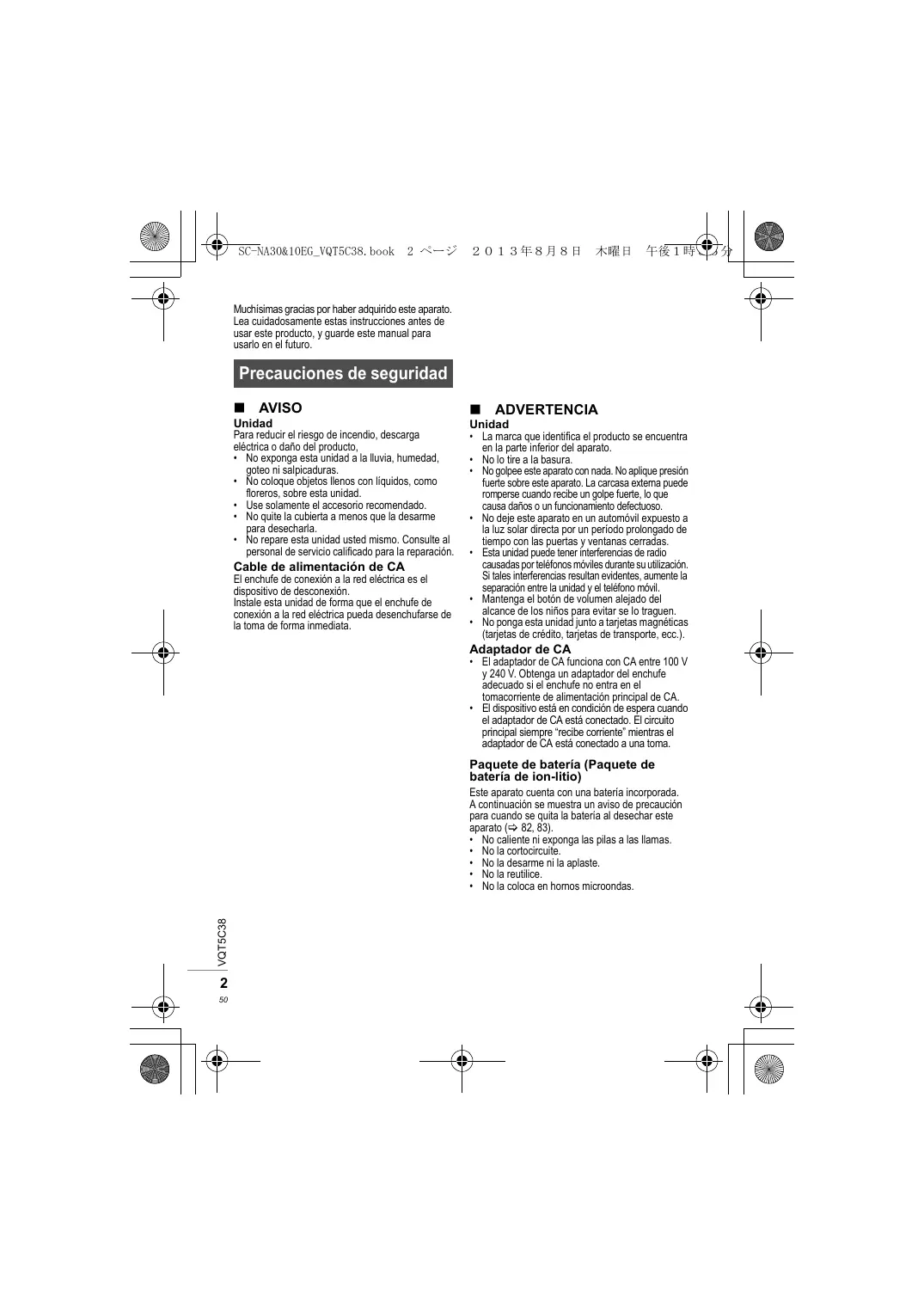 - Ante de utilizar un paño tratado químicamente, lea cuidadosamente sus instrucciones de uso. Contenidos Precauciones de seguridad ................................................................ 2 Acerca de Bluetooth® .......................................................................... 4 Licencias............................................................................................. 4 Mantenimiento .................................................................................... 4 Accesorios .......................................................................................... 5 Guía de referencia de control (SC-NA30) .......................................... 6 Guía de referencia de control (SC-NA10) .......................................... 7 Acerca de la alimentación de este aparato ........................................ 8 Acerca del terminal de salida de CC (USB) ....................................... 9 Escucha de audio desde un dispositivo Bluetooth® .......................... 10 Conexión vía menú de Bluetooth® .............................................................. 10 Conexión de un solo toque (conexión vía NFC) ......................................... 11 Cambio de la calidad de comunicación....................................................... 12 Desconexión del Bluetooth® ........................................................................ 12 Usar el modo LP ............................................................................... 13 Uso de la entrada AUX ..................................................................... 13 Apagado automático......................................................................... 13 Recibir una llamada con el dispositivo manos libres ........................ 14 Para volver a los ajustes de fábrica.................................................. 14 Solución de problemas ..................................................................... 15 Especificaciones ............................................................................... 16 Para retirar la batería al desechar este aparato ............................... 82 ∏ 1 Adaptador de CA ∏ 1 Cable de alimentación de CA ∏ 1 Estuche de viaje (SC-NA30 solamente) ESPAÑOL Accesorios Compruebe los accesorios antes de utilizar esta unidad. Nota VQT5C38