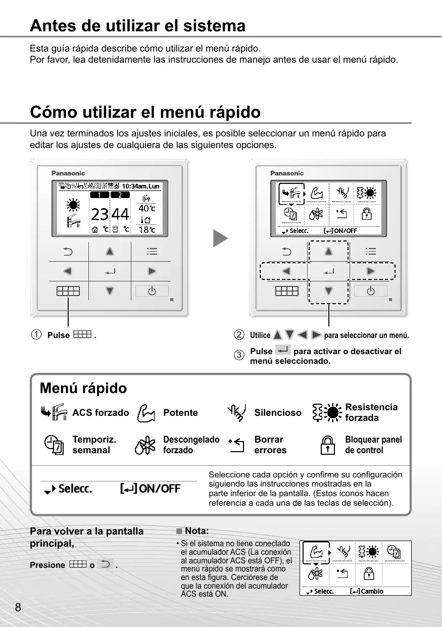 • Si el sistema no tiene conectado el acumulador ACS (La conexión al acumulador ACS está OFF), el menú rápido se mostrará como en esta figura. Cerciórese de que la conexión del acumulador ACS está ON.