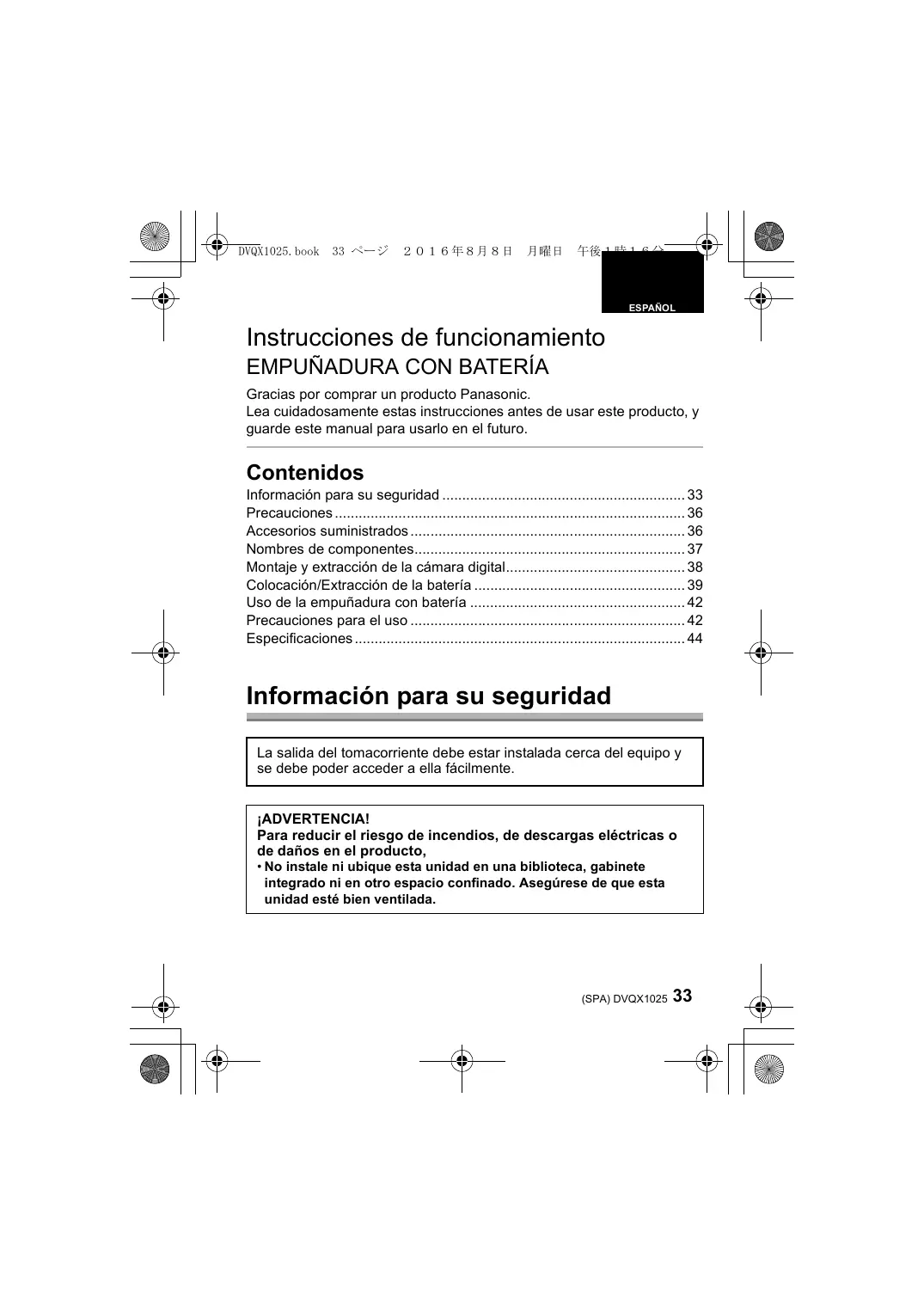 - Gracias por comprar un producto Panasonic. Lea cuidadosamente estas instrucciones antes de usar este producto, y guarde este manual para usarlo en el futuro. Contenidos Información para su seguridad p. 33