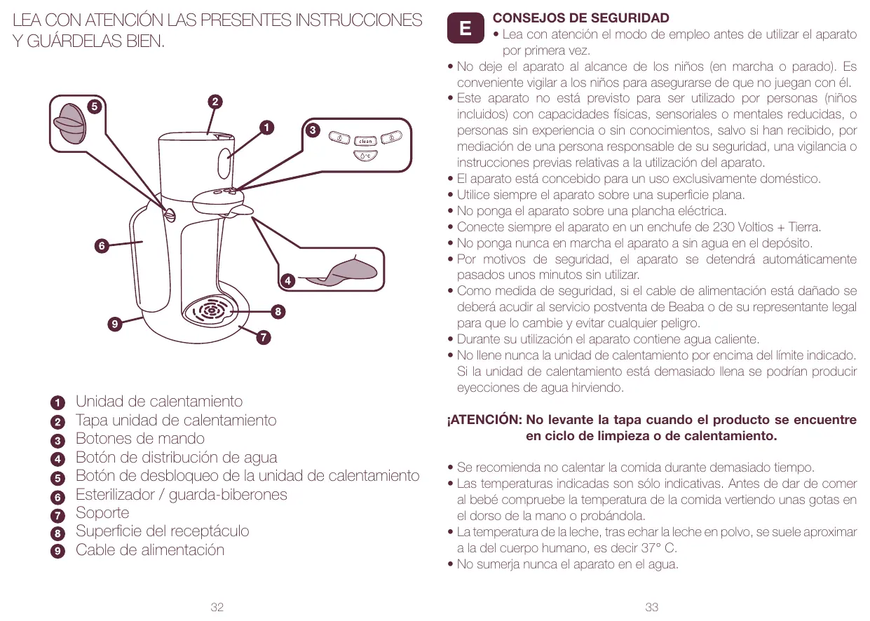 • Lea con atención el modo de empleo antes de utilizar el aparato por primera vez. • No deje el aparato al alcance de los niños (en marcha o parado). Es conveniente vigilar a los niños para asegurarse de que no juegan con él. • Este aparato no está previsto para ser utilizado por personas (niños incluidos) con capacidades físicas, sensoriales o mentales reducidas, o personas sin experiencia o sin conocimientos, salvo si han recibido, por mediación de una persona responsable de su seguridad, una vigilancia o instrucciones previas relativas a la utilización del aparato. • El aparato está concebido para un uso exclusivamente doméstico. • Utilice siempre el aparato sobre una superficie plana. • No ponga el aparato sobre una plancha eléctrica. • Conecte siempre el aparato en un enchufe de 230 Voltios + Tierra. • No ponga nunca en marcha el aparato a sin agua en el depósito. • Por motivos de seguridad, el aparato se detendrá automáticamente pasados unos minutos sin utilizar. • Como medida de seguridad, si el cable de alimentación está dañado se deberá acudir al servicio postventa de Beaba o de su representante legal para que lo cambie y evitar cualquier peligro. • Durante su utilización el aparato contiene agua caliente. • No llene nunca la unidad de calentamiento por encima del límite indicado. Si la unidad de calentamiento está demasiado llena se podrían producir eyecciones de agua hirviendo. ¡ATENCIÓN: No levante la tapa cuando el producto se encuentre en ciclo de limpieza o de calentamiento. • Se recomienda no calentar la comida durante demasiado tiempo. • Las temperaturas indicadas son sólo indicativas. Antes de dar de comer al bebé compruebe la temperatura de la comida vertiendo unas gotas en el dorso de la mano o probándola. • La temperatura de la leche, tras echar la leche en polvo, se suele aproximar a la del cuerpo humano, es decir 37° C. • No sumerja nunca el aparato en el agua. 33