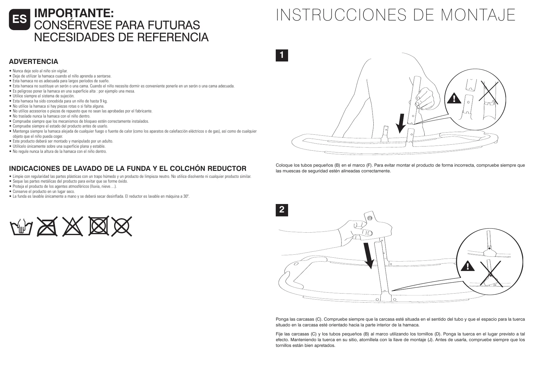 • Deje de utilizar la hamaca cuando el niño aprenda a sentarse. • Esta hamaca no es adecuada para largos períodos de sueño. • Esta hamaca no sustituye un serón o una cama. Cuando el niño necesite dormir es conveniente ponerle en un serón o una cama adecuada. • Es peligroso poner la hamaca en una superficie alta : por ejemplo una mesa. • Utilice siempre el sistema de sujeción. • Esta hamaca ha sido concebida para un niño de hasta 9 kg. • No utilice la hamaca si hay piezas rotas o si falta alguna. • No utilice accesorios o piezas de repuesto que no sean las aprobadas por el fabricante. • No traslade nunca la hamaca con el niño dentro. • Compruebe siempre que los mecanismos de bloqueo estén correctamente instalados. • Compruebe siempre el estado del producto antes de usarlo. • Mantenga siempre la hamaca alejada de cualquier fuego o fuente de calor (como los aparatos de calefacción eléctricos o de gas), así como de cualquier objeto que el niño pueda coger. • Este producto deberá ser montado y manipulado por un adulto. • Utilícelo únicamente sobre una superficie plana y estable. • No regule nunca la altura de la hamaca con el niño dentro.