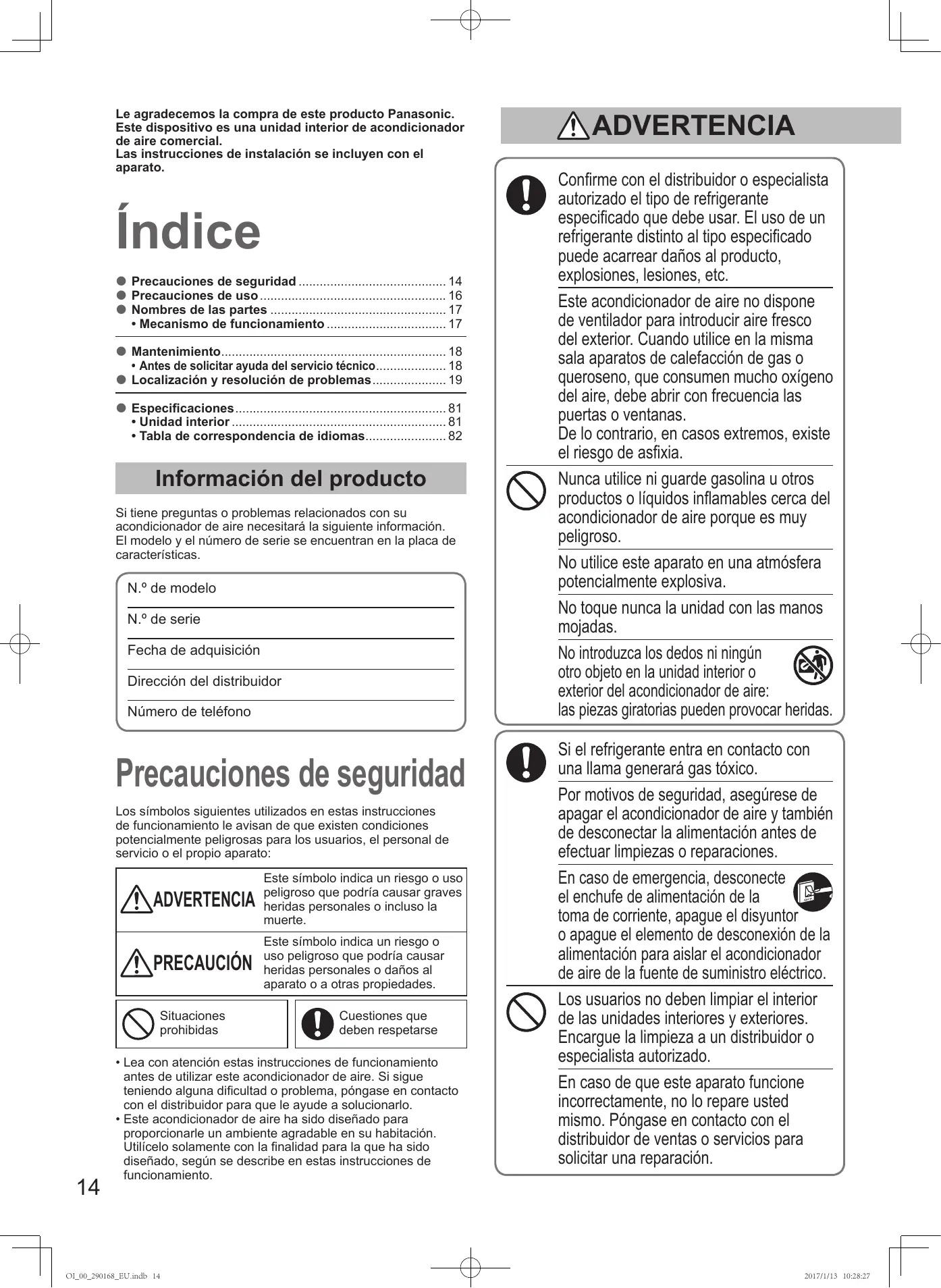 Precauciones de seguridad 14 zz Precauciones de uso 16 zz Nombres de las partes 17 zz • Mecanismo de funcionamiento 17 Mantenimiento 18 zz • Antes de solicitar ayuda del servicio técnico 18 Localización y resolución de problemas 19 zz Especificaciones 81 zz • Unidad interior 81 • Tabla de correspondencia de idiomas 82
