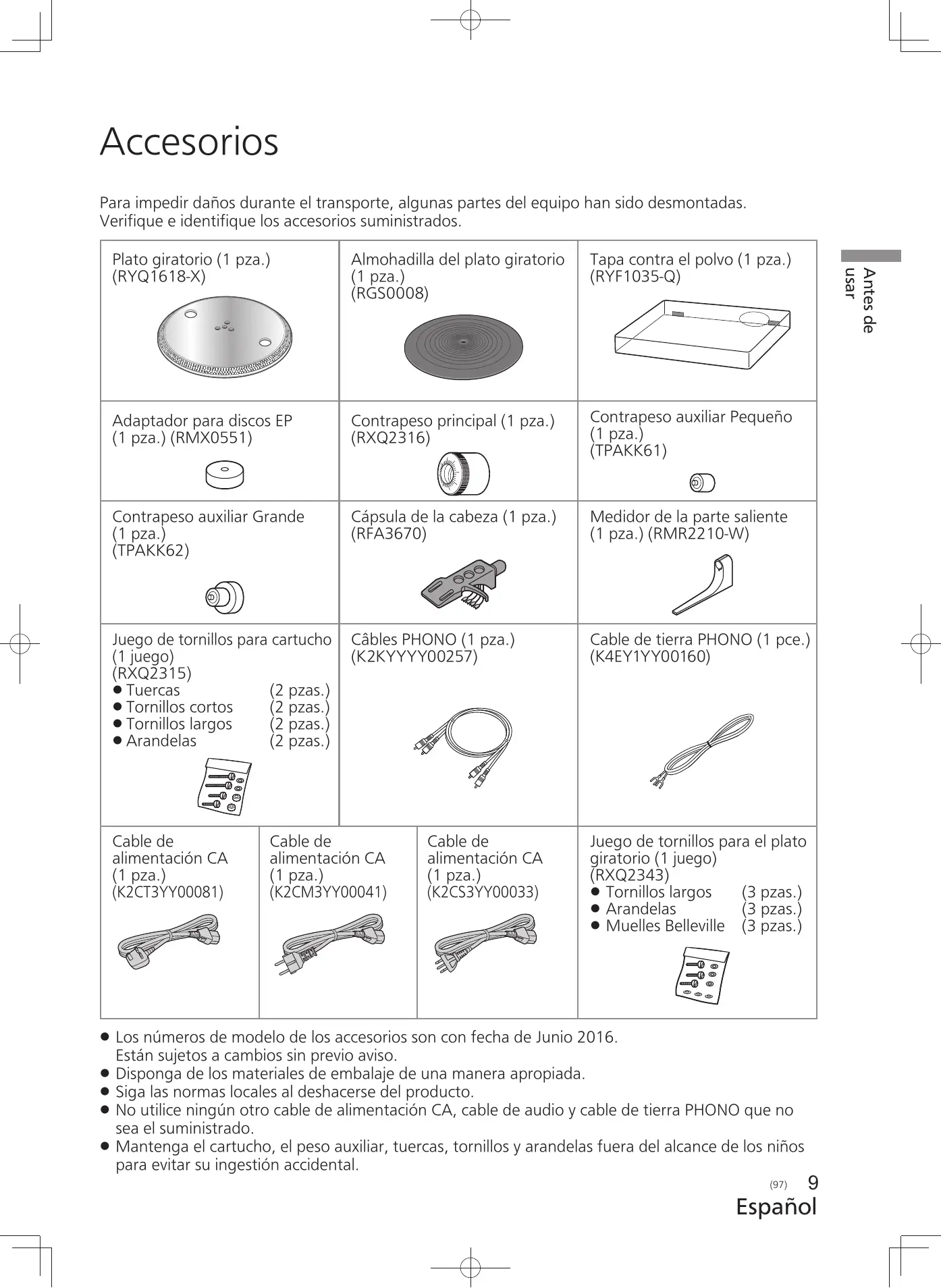 Español (95) Antes de usar Accesorios Para impedir daños durante el transporte, algunas partes del equipo han sido desmontadas. Verifique e identifique los accesorios suministrados. Almohadilla del plato giratorio (1 pza.) (RGS0008) Tapa contra el polvo (1 pza.) (RYF1035-Q) Adaptador para discos EP (1 pza.) (RMX0551) Contrapeso auxiliar Pequeño (1 pza.) (TPAKK61) Cápsula de la cabeza (1 pza.) (RFA3670) Medidor de la parte saliente (1 pza.) (RMR2210-W) Juego de tornillos para cartucho (1 juego) (RXQ2315) (2 pzas.) Tuercas (2 pzas.) Tornillos cortos (2 pzas.) Tornillos largos (2 pzas.) Arandelas Cable de alimentación CA (1 pza.) (K2CT3YY00081) Cable de alimentación CA (1 pza.) (K2CM3YY00041) Cable de alimentación CA (1 pza.) (K2CS3YY00033) Juego de tornillos para el plato giratorio (1 juego) (RXQ2343) (3 pzas.) Tornillos largos (3 pzas.) Arandelas Muelles Belleville (3 pzas.) Los números de modelo de los accesorios son con fecha de Junio 2016. Están sujetos a cambios sin previo aviso. Disponga de los materiales de embalaje de una manera apropiada. Siga las normas locales al deshacerse del producto. No utilice ningún otro cable de alimentación CA, cable de audio y cable de tierra PHONO que no sea el suministrado. Mantenga el cartucho, el peso auxiliar, tuercas, tornillos y arandelas fuera del alcance de los niños para evitar su ingestión accidental.
