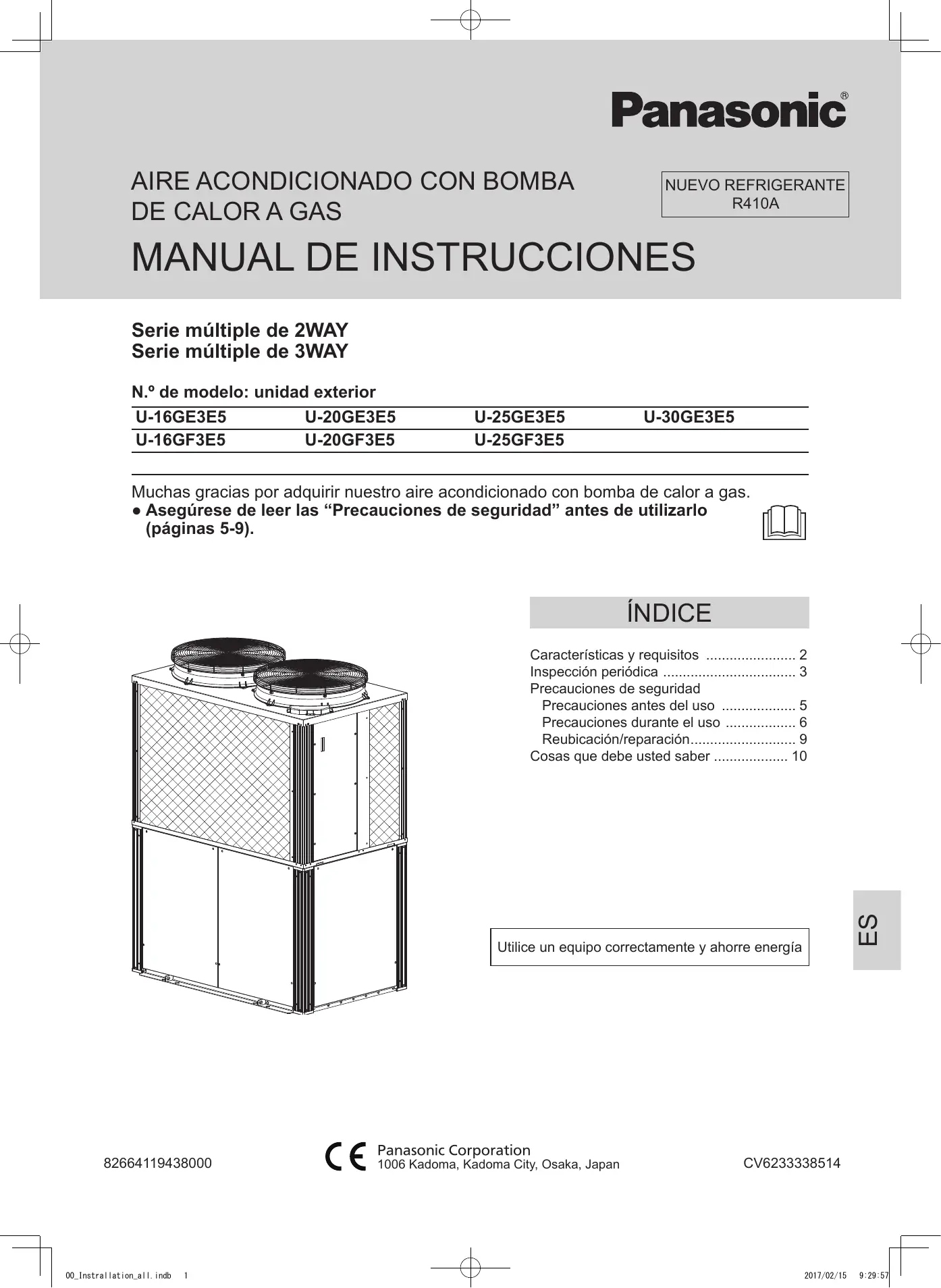 Serie múltiple de 2WAY Serie múltiple de 3WAY N.º de modelo: unidad exterior U-16GE3E5 U-20GE3E5 U-16GF3E5 U-20GF3E5 U-25GE3E5 U-25GF3E5 U-30GE3E5 Muchas gracias por adquirir nuestro aire acondicionado con bomba de calor a gas. ● Asegúrese de leer las “Precauciones de seguridad” antes de utilizarlo (páginas 5-9). ÍNDICE
