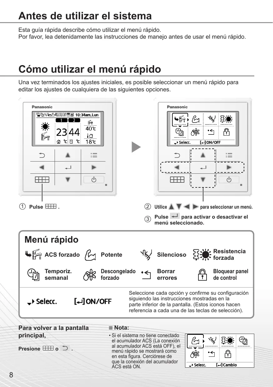 • Si el sistema no tiene conectado el acumulador ACS (La conexión al acumulador ACS está OFF), el menú rápido se mostrará como en esta figura. Cerciórese de que la conexión del acumulador ACS está ON.