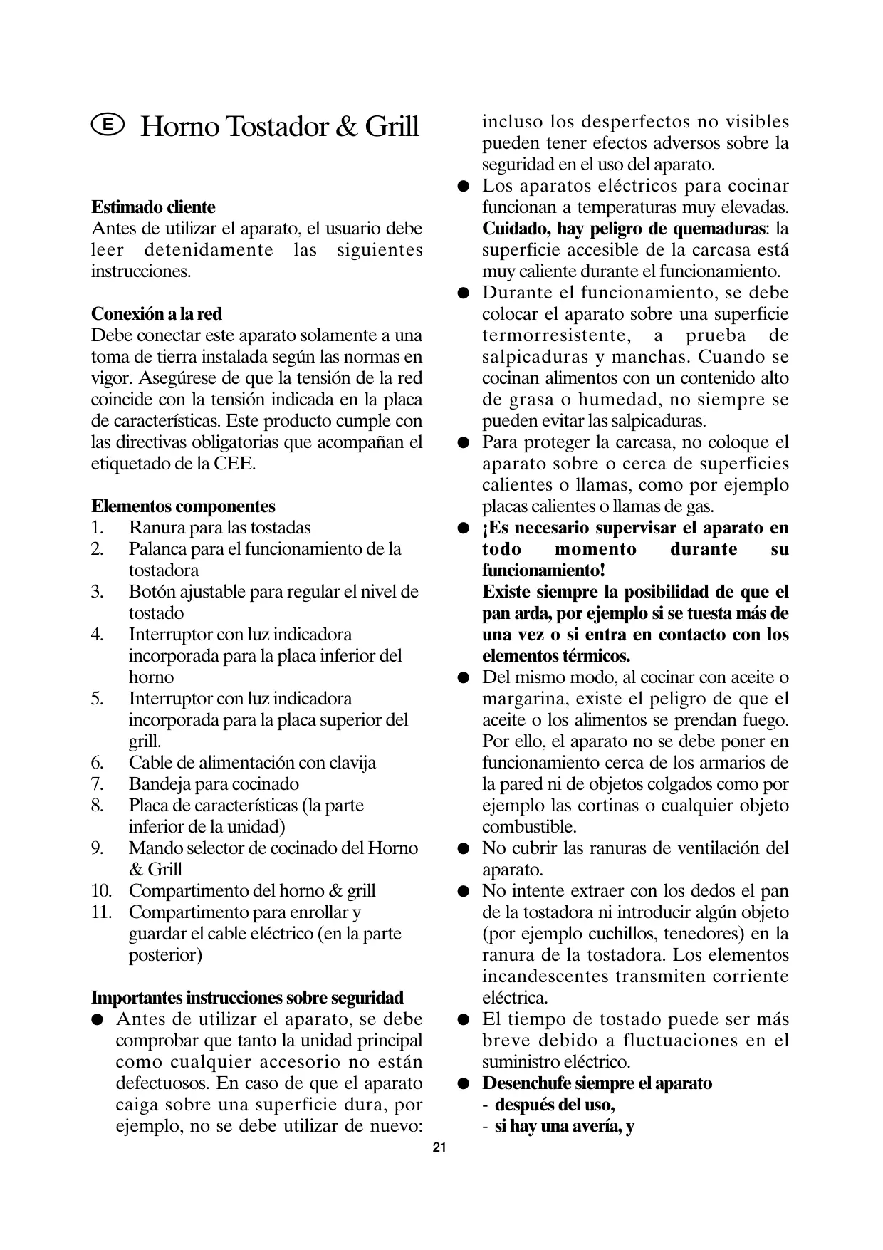 Cuando se enciende el aparato por primera vez, puede que el tostador emita un leve olor, que desaparecerá afterwards de poco instantos. Se debe asegurar una ventilación