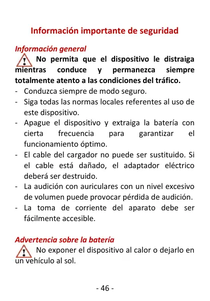 Información importante de seguridad Información general No permita que el dispositivo le distraiga mientras conduce y permanezca siempre totalmente atento a las condiciones del tráfico. - Conduzca siempre de modo seguro. - Siga todas las normas locales referentes al uso de este dispositivo. - Apague el dispositivo y extraiga la batería con cierta frecuencia para garantizar funcionamiento óptimo. - El cable del cargador no puede ser sustituido. Si el cable está dañado, el adaptador eléctrico deberá ser destruido. - La audición con auriculares con un nivel excesivo de volumen puede provocar pérdida de audición. - La toma de corriente del aparato debe ser fácilmente accesible. Advertencia sobre la batería No exponer el dispositivo al calor o dejarlo en un vehículo al sol.