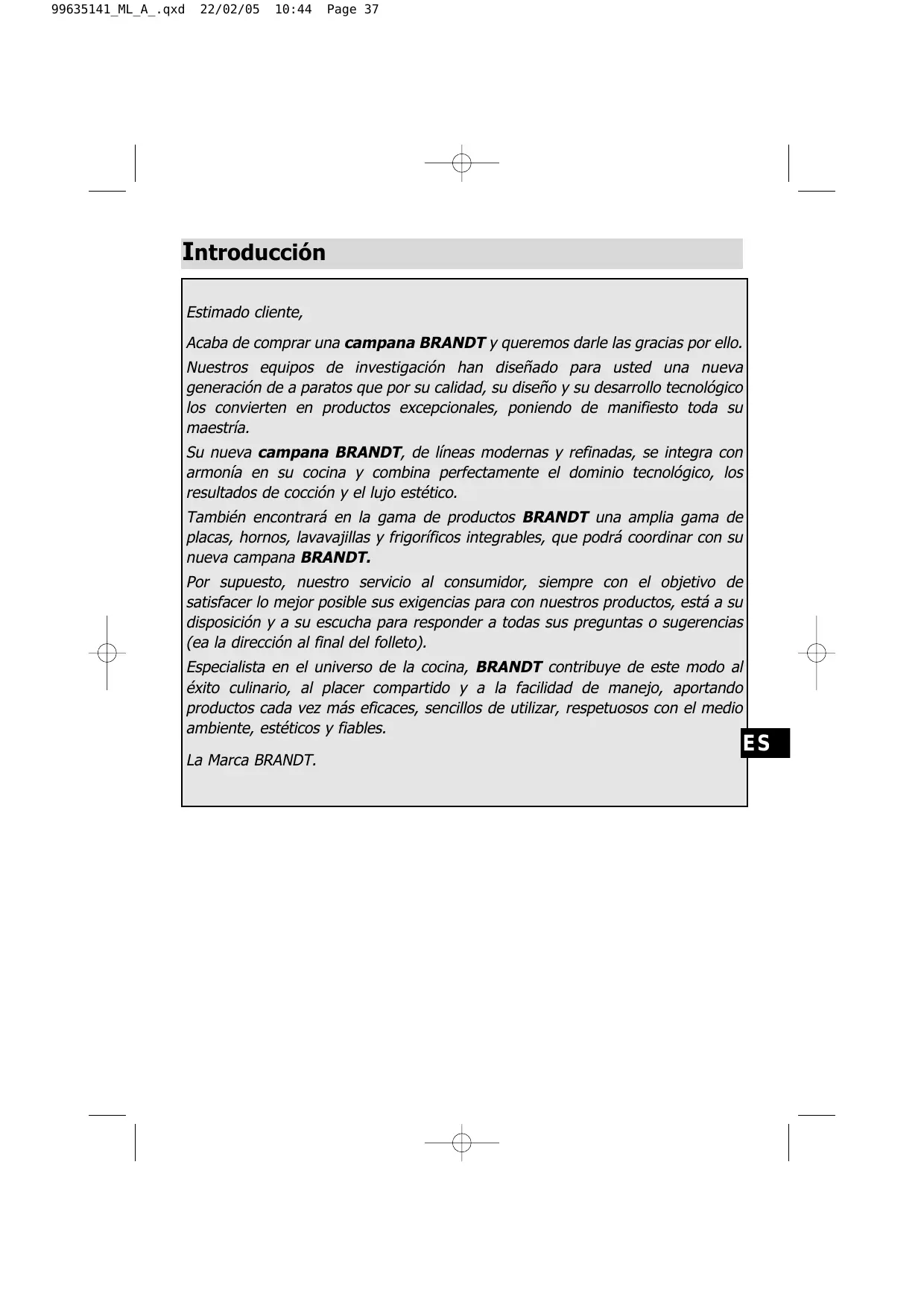 Introducción Estimado cliente, Acaba de comprar una campana BRANDT y queremos darle las gracias por ello. Nuestros equipos de investigación han diseñado para usted una nueva generación de a paratos que por su calidad, su diseño y su desarrollo tecnológico los convierten en productos excepcionales, poniendo de manifiesto toda su maestría. Su nueva campana BRANDT, de líneas modernas y refinadas, se integra con armonía en su cocina y combina perfectamente el dominio tecnológico, los resultados de cocción y el lujo estético. También encontrará en la gama de productos BRANDT una amplia gama de placas, hornos, lavavajillas y frigoríficos integrables, que podrá coordinar con su nueva campana BRANDT. Por supuesto, nuestro servicio al consumidor, siempre con el objetivo de satisfacer lo mejor posible sus exigencias para con nuestros productos, está a su disposición y a su escucha para responder a todas sus preguntas o sugerencias (ea la dirección al final del folleto). Especialista en el universo de la cocina, BRANDT contribuye de este modo al éxito culinario, al placer compartido y a la facilidad de manejo, aportando productos cada vez más eficaces, sencillos de utilizar, respetuosos con el medio ambiente, estéticos y fiables. La Marca BRANDT.