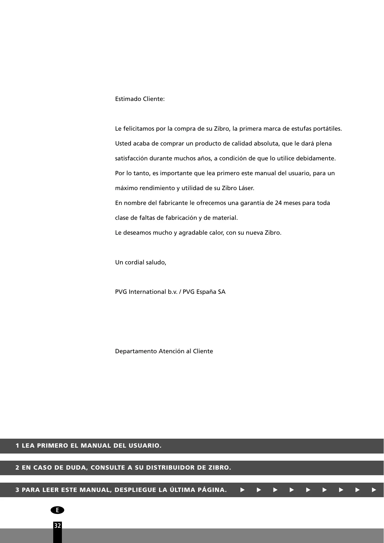 M knappen en gang. timer save Le felicitamos por la compra de su Zibro, la primera marca de estufas portátiles. Usted acaba de comprar un producto de calidad absoluta, que le dará plena satisfacción durante muchos años, a condición de que lo utilice debidamente. Por lo tanto, es importante que lea primero este manual del usuario, para un máximo rendimiento y utilidad de su Zibro Láser. En nombre del fabricante le ofrecemos una garantía de 24 meses para toda clase de faltas de fabricación y de material. Le deseamos mucho y agradable calor, con su nueva Zibro. Un cordial saludo, Departamento Atención al Cliente 1 LEA PRIMERO EL MANUAL DEL USUARIO. 2 EN CASO DE DUDA, CONSULTE A SU DISTRIBUIDOR DE ZIBRO. Estos son a grandes rasgos los pasos a seguir para la utilización de su Zibro. Para su correcta utilización, le