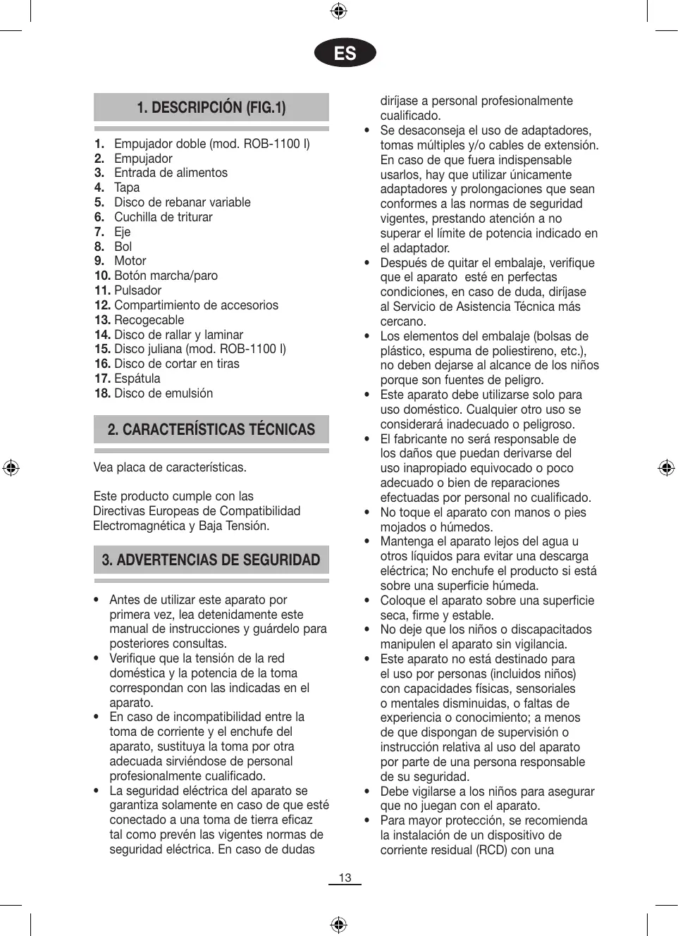 corriente residual operativa que no supere los 30 mA. Pida consejo a su instalador. No abandonar el aparato encendido porque puede ser una fuente de peligro. Al desenchufar la clavija nunca tire del cable. Desenchufe el aparato antes de efectuar cualquier operación de limpieza o mantenimiento. En caso de avería o mal funcionamiento del aparato y siempre que no vaya a utilizar, apáguelo y no trate de arreglarlo. En caso de necesitar reparación diríjase únicamente a un Servicio de Asistencia Técnica autorizado por el fabricante y solicitar el uso de recambios originales. Si el cable de este aparato resulta dañado, diríjase a un Centro de Asistencia técnico autorizado para que lo sustituyan. No deje el aparato expuesto a los agentes atmosféricos (lluvia, sol, hielo etc.). No utilice o coloque ninguna parte de este aparato sobre o cerca de superficies calientes (placas de cocina de gas o eléctrica u hornos). No utilice detergentes o bayetas abrasivas para limpiar la unidad. No toque las superficies calientes. Utilice los mangos o asideros. Evite que el cable toque las partes calientes del aparato. Tenga mucho cuidado al manipular las cuchillas de triturar y discos de corte, están muy afiladas. Desconecte el aparato antes de retirar y cambiar las cuchillas. No retire la tapa hasta que las cuchillas hayan dejado de girar Sujete la cuchilla y los discos sólo por el eje ya que existe riesgo de cortes. Desenchufe el aparato antes de colocar o retirar los accesorios, antes de proceder a su limpieza y cuando no vaya a utilizar el aparato. No vierta líquidos calientes al bol. No lo tenga en funcionamiento continuo más de 4 minutos. Retire siempre la cuchilla antes de vaciar el contenido del bol. No use nunca los dedos para empujar los alimentos dentro del robot.