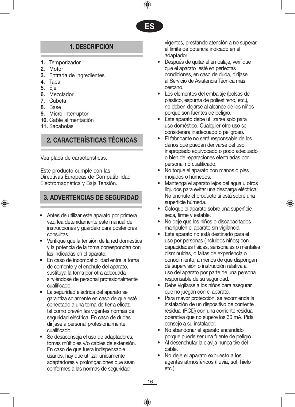 vez, limpie la base (8), la tapa (4), el mezclador (6) y la cubeta (7), en agua templada y jabón líquido. No utilice detergentes abrasivos ni estropajos metálicos. No sumerja el motor en agua ni en ningún otro líquido.