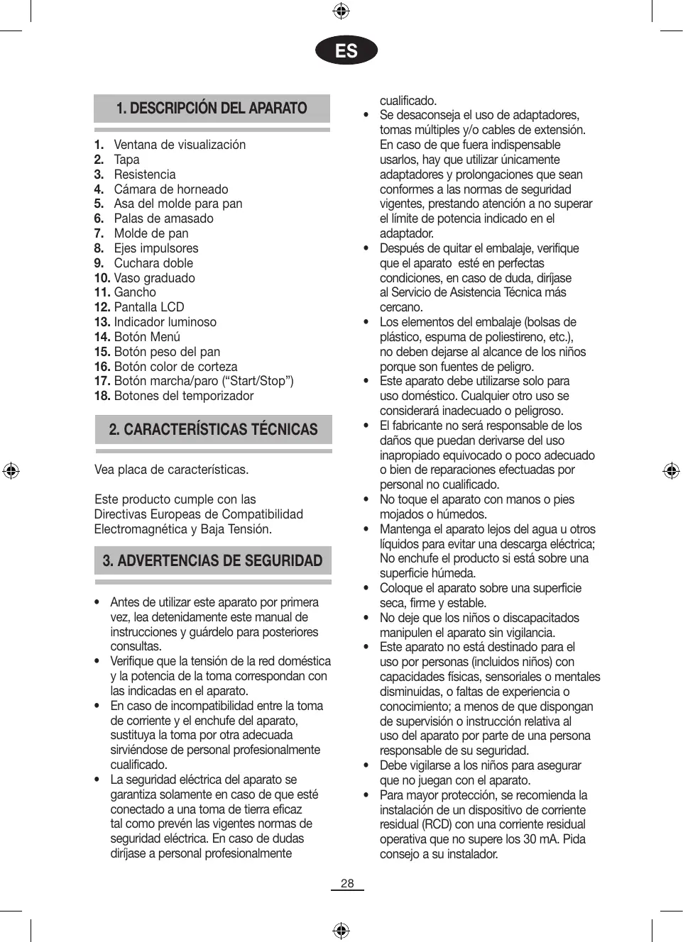 1. Ventana de visualización 2. Tapa 3. Resistencia 4. Cámara de horneado 5. Asa del molde para pan 6. Palas de amasado 7. Molde de pan 8. Ejes impulsores 9. Cuchara doble 10. Vaso graduado 11. Gancho 12. Pantalla LCD 13. Indicador luminoso 14. Botón Menú 15. Botón peso del pan 16. Botón color de corteza 17. Botón marcha/paro (“Start/Stop”) 18. Botones del temporizador