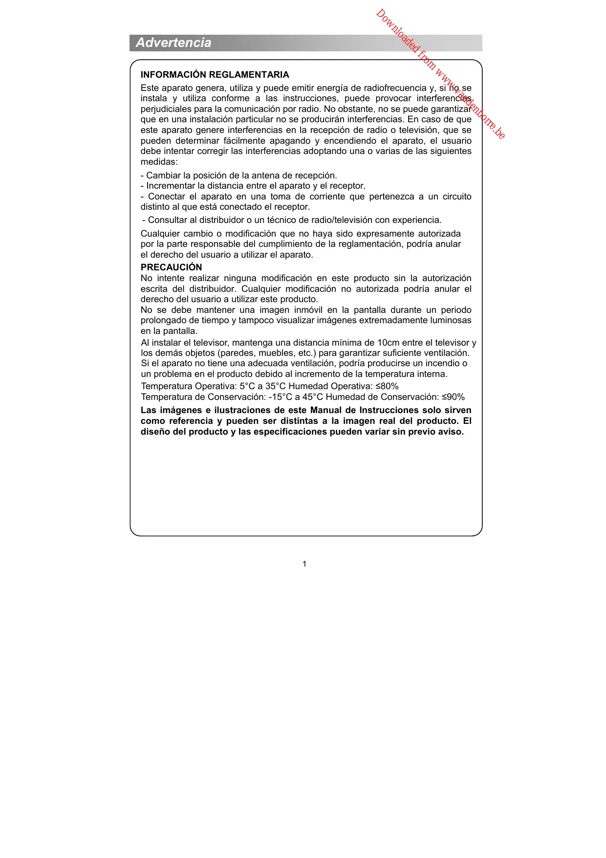 Este aparato genera, utiliza y puede emitir energía de radiofrecuencia y, si no se instala y utiliza conforme a las instrucciones, puede provocar interferencias perjudiciales para la comunicación por radio. No obstante, no se puede garantizar que en una instalación particular no se producirán interferencias. En caso de que este aparato genere interferencias en la recepción de radio o televisión, que se pueden determinar fácilmente apagando y encendiendo el aparato, el usuario debe intentar corregir las interferencias adoptando una o varias de las siguientes medidas: - Cambiar la posición de la antena de recepción. - Incrementar la distancia entre el aparato y el receptor. - Conectar el aparato en una toma de corriente que pertenezca a un circuito distinto al que está conectado el receptor. - Consultar al distribuidor o un técnico de radio/televisión con experiencia. Cualquier cambio o modificación que no haya sido expresamente autorizada por la parte responsable del cumplimiento de la reglamentación, podría anular el derecho del usuario a utilizar el aparato. PRECAUCIÓN No intente realizar ninguna modificación en este producto sin la autorización escrita del distribuidor. Cualquier modificación no autorizada podría anular el derecho del usuario a utilizar este producto. No se debe mantener una imagen inmóvil en la pantalla durante un periodo prolongado de tiempo y tampoco visualizar imágenes extremadamente luminosas en la pantalla. Al instalar el televisor, mantenga una distancia mínima de 10cm entre el televisor y los demás objetos (paredes, muebles, etc.) para garantizar suficiente ventilación. Si el aparato no tiene una adecuada ventilación, podría producirse un incendio o un problema en el producto debido al incremento de la temperatura interna. Temperatura Operativa: 5 °C a 35 °C Humedad Operativa: ≤80% Temperatura de Conservación: -15 °C a 45 °C Humedad de Conservación: ≤90% Las imágenes e ilustraciones de este Manual de Instrucciones solo sirven como referencia y pueden ser distintas a la imagen real del producto. El diseño del producto y las especificaciones pueden variar sin previo aviso.