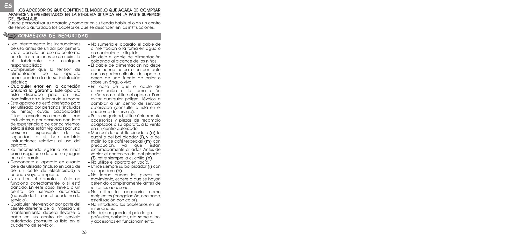 - Antes de utiliser el aparato por primera vez, retire il plástico protector de la cucilla picadora (e) con多么 cuidado, bajo que está muy aflilada, y lave todas las piezas de los accesorios con agua caliente y jabón. Aclarables y sequelas.