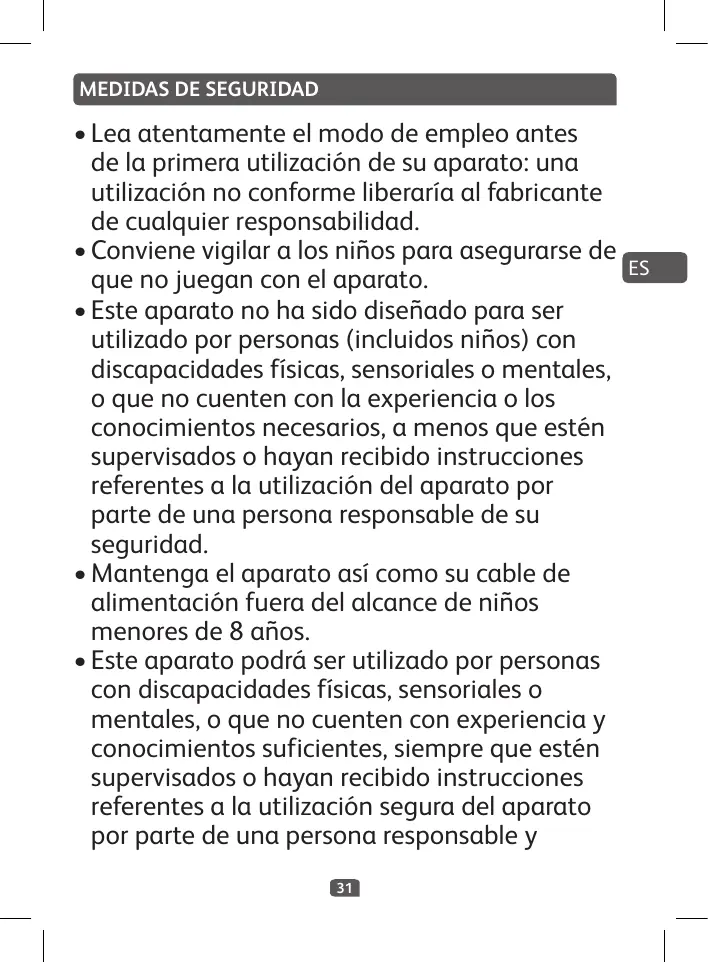 • Conviene vigilar a los niños para asegurarse de que no juegan con el aparato. • Este aparato no ha sido diseñado para ser utilizado por personas (incluidos niños) con discapacidades físicas, sensoriales o mentales, o que no cuenten con la experiencia o los conocimientos necesarios, a menos que estén supervisados o hayan recibido instrucciones referentes a la utilización del aparato por parte de una persona responsable de su seguridad. • Mantenga el aparato así como su cable de alimentación fuera del alcance de niños menores de 8 años. • Este aparato podrá ser utilizado por personas con discapacidades físicas, sensoriales o mentales, o que no cuenten con experiencia y conocimientos suficientes, siempre que estén supervisados o hayan recibido instrucciones referentes a la utilización segura del aparato por parte de una persona responsable y 31