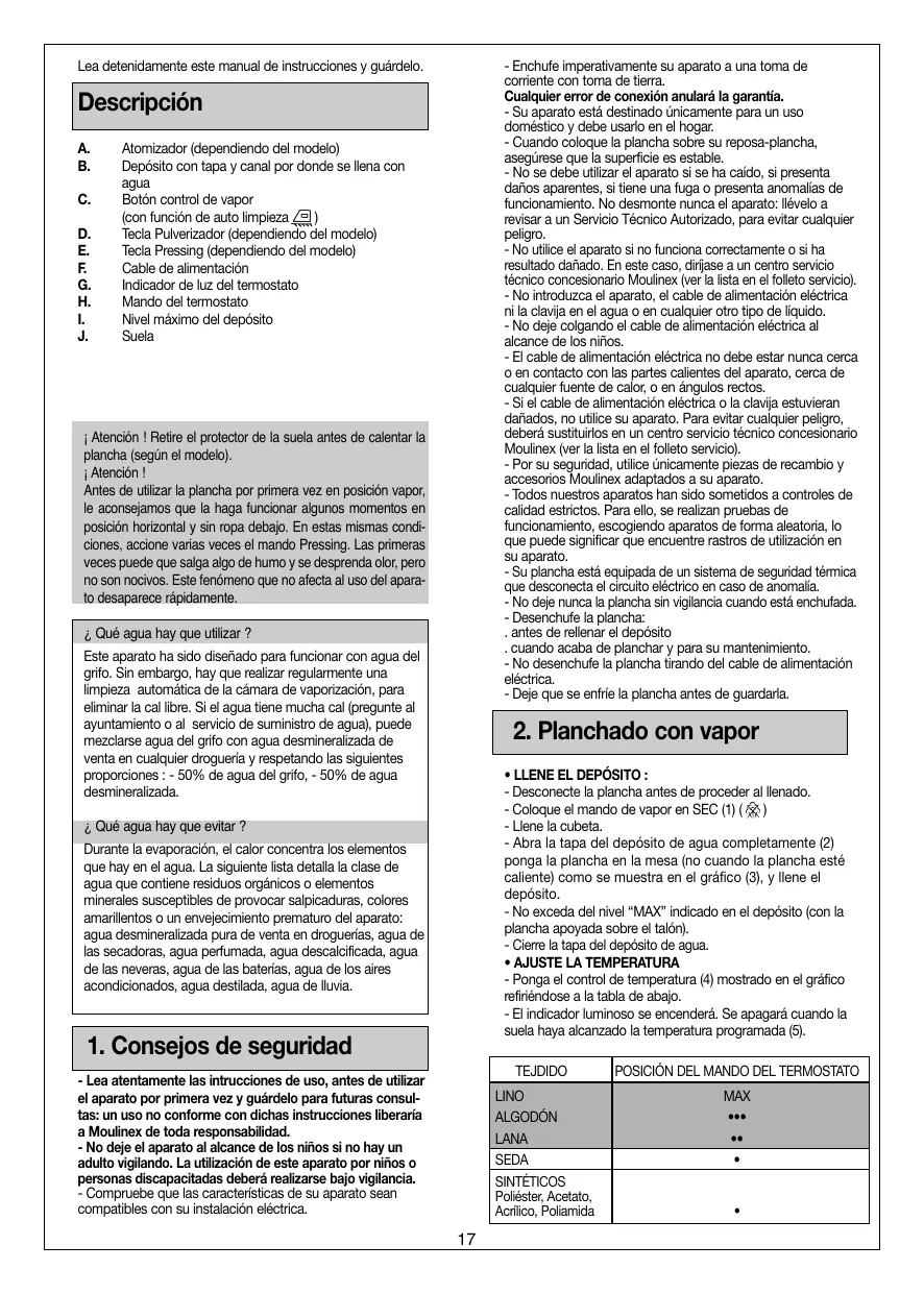 Cualquier error de conexión anulará la garantía. - Su aparato está destinado únicamente para un uso doméstico y debe usarlo en el hogar. - Cuando coloque la plancha sobre su reposa-plancha, asegúrese que la superficie es estable. - No se debe utilizar el aparato si se ha caído, si presenta daños aparentes, si tiene una fuga o presenta anomalías de funcionamiento. No desmonte nunca el aparato: llévelo a revisar a un Servicio Técnico Autorizado, para evitar cualquier peligro. - No utilice el aparato si no funciona correctamente o si ha resultado dañado. En este caso, diríjase a un centro servicio técnico concesionario Moulinex (ver la lista en el folleto servicio). - No introduzca el aparato, el cable de alimentación eléctrica ni la clavija en el agua o en cualquier otro tipo de líquido. - No deje colgando el cable de alimentación eléctrica al alcance de los niños. - El cable de alimentación eléctrica no debe estar nunca cerca o en contacto con las partes calientes del aparato, cerca de cualquier fuente de calor, o en ángulos rectos. - Si el cable de alimentación eléctrica o la clavija estuvieran dañados, no utilice su aparato. Para evitar cualquier peligro, deberá sustituirlos en un centro servicio técnico concesionario Moulinex (ver la lista en el folleto servicio). - Por su seguridad, utilice únicamente piezas de recambio y accesorios Moulinex adaptados a su aparato. - Todos nuestros aparatos han sido sometidos a controles de calidad estrictos. Para ello, se realizan pruebas de funcionamiento, escogiendo aparatos de forma aleatoria, lo que puede significar que encuentre rastros de utilización en su aparato. - Su plancha está equipada de un sistema de seguridad térmica que desconecta el circuito eléctrico en caso de anomalía. - No deje nunca la plancha sin vigilancia cuando está enchufada. - Desenchufe la plancha: . antes de rellenar el depósito . cuando acaba de planchar y para su mantenimiento. - No desenchufe la plancha tirando del cable de alimentación eléctrica. - Deje que se enfríe la plancha antes de guardarla.