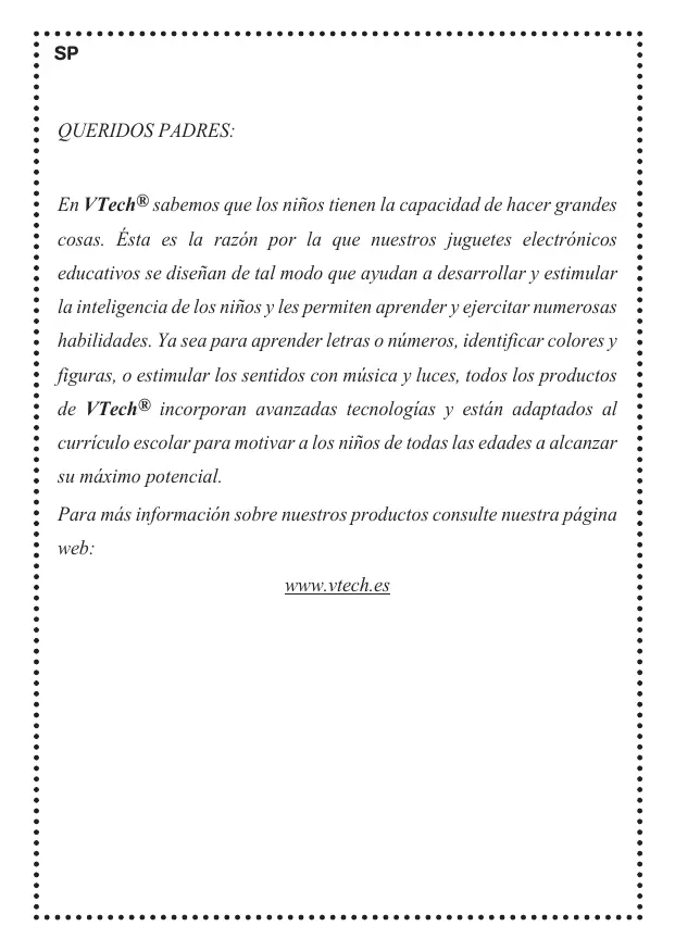 QUERIDOS PADRES: En VTech® sabemos que los niños tienen la capacidad de hacer grandes cosas. Ésta es la razón por la que nuestros juguetes electrónicos educativos se diseñan de tal modo que ayudan a desarrollar y estimular la inteligencia de los niños y les permiten aprender y ejercitar numerosas habilidades. Ya sea para aprender letras o números, identificar colores y figuras, o estimular los sentidos con música y luces, todos los productos de VTech® incorporan avanzadas tecnologías y están adaptados al currículo escolar para motivar a los niños de todas las edades a alcanzar su máximo potencial. Para más información sobre nuestros productos consulte nuestra página web: www.vtech.es