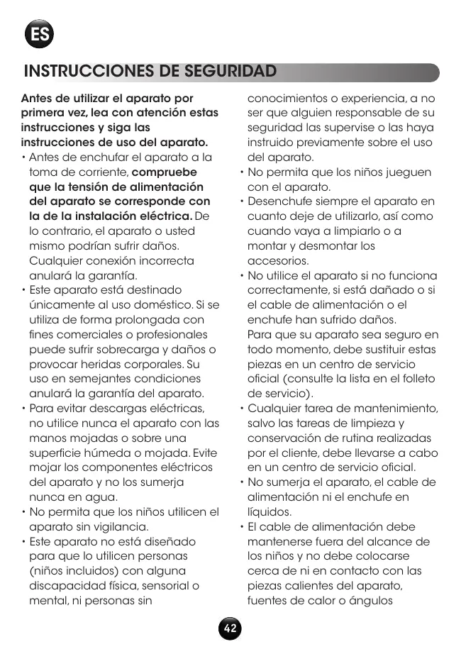 ES INSTRUCCIONES DE SEGURIDAD conocimientos o experiencia, a no ser que alguien responsable de su seguridad las supervise o las haya instruido previamente sobre el uso del aparato. • No permita que los niños jueguen con el aparato. • Desenchufe siempre el aparato en cuanto deje de utilizarlo, así como cuando vaya a limpiarlo o a montar y desmontar los accesorios. • No utilice el aparato si no funciona correctamente, si está dañado o si el cable de alimentación o el enchufe han sufrido daños. Para que su aparato sea seguro en todo momento, debe sustituir estas piezas en un centro de servicio oficial (consulte la lista en el folleto de servicio). • Cualquier tarea de mantenimiento, salvo las tareas de limpieza y conservación de rutina realizadas por el cliente, debe llevarse a cabo en un centro de servicio oficial. • No sumerja el aparato, el cable de alimentación ni el enchufe en líquidos. • El cable de alimentación debe mantenerse fuera del alcance de los niños y no debe colocarse cerca de ni en contacto con las piezas calientes del aparato, fuentes de calor o ángulos