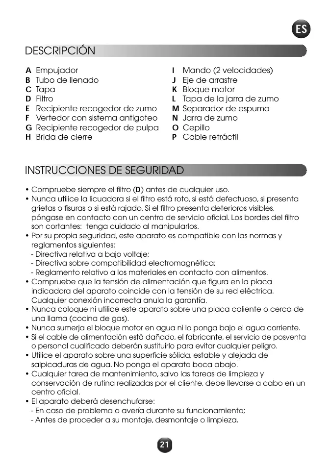 El aparato está equipado con un sistema de seguridad. Para poder utilizar la licuadora, la tapa (C) deberá estar correctamente bloqueada con la brida de cierre (H). Al soltar la brida de cierre (H) la licuadora se detendrá. Al finalizar un ciclo de uso, sitúe el mando (I) en la posición 0 y espere a que el filtro (D) se detenga por completo antes de quitar la tapa.