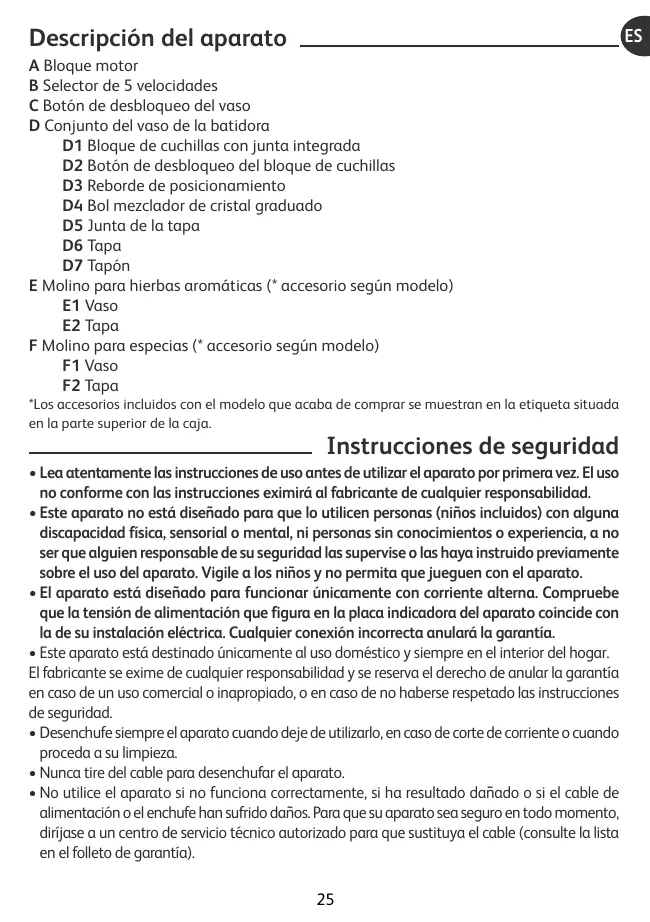 Descripción del aparato A Bloque motor B Selector de 5 velocidades C Botón de desbloqueo del vaso D Conjunto del vaso de la batidora D1 Bloque de cuchillas con junta integrada D2 Botón de desbloqueo del bloque de cuchillas D3 Reborde de posicionamiento D4 Bol mezclador de cristal graduado D5 Junta de la tapa D6 Tapa D7 Tapón E Molino para hierbas aromáticas (* accesorio según modelo) E1 Vaso E2 Tapa F Molino para especias (* accesorio según modelo) F1 Vaso F2 Tapa *Los accesorios incluidos con el modelo que acaba de comprar se muestran en la etiqueta situada en la parte superior de la caja.