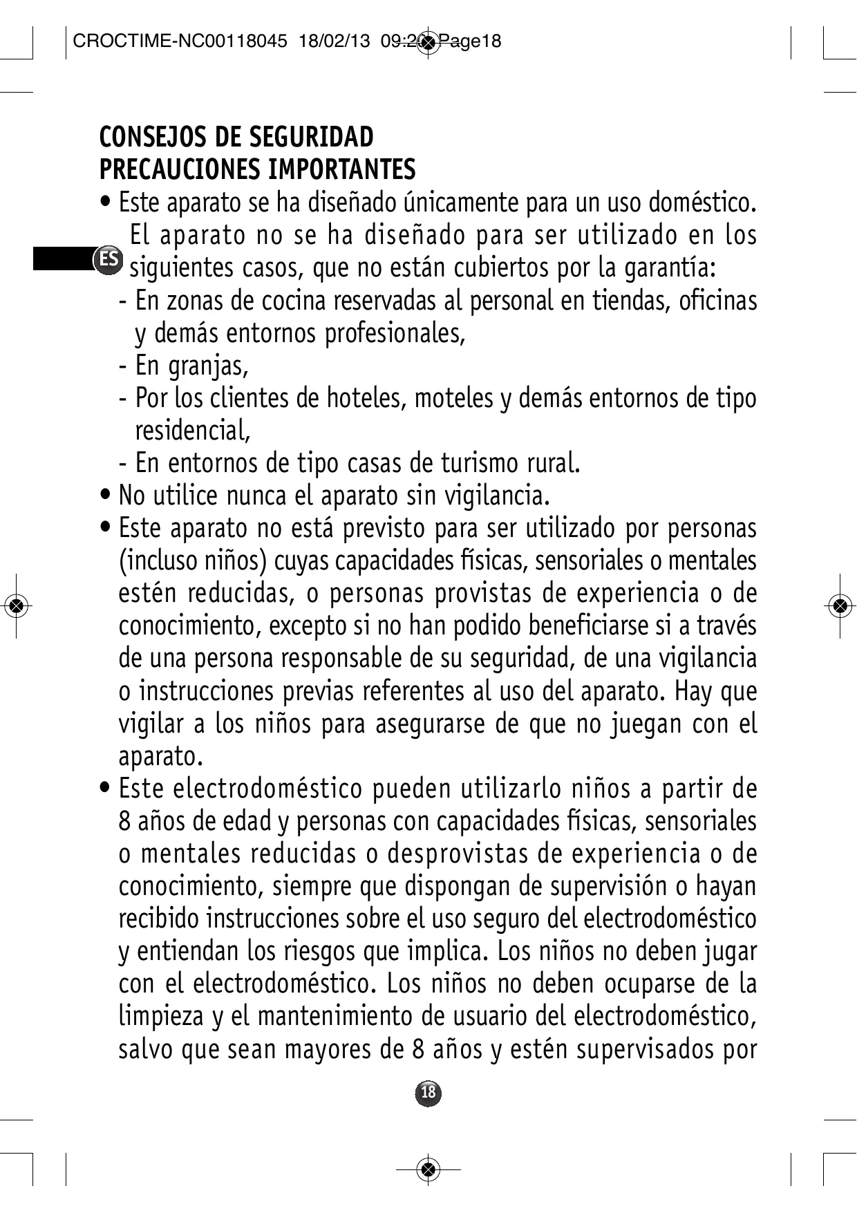 CONSEJOS DE SEGURIDAD PRECAUCIONES IMPORTANTES • Este aparato se ha diseñado únicamente para un uso doméstico. El aparato no se ha diseñado para ser utilizado en los ES siguientes casos, que no están cubiertos por la garantía: - En zonas de cocina reservadas al personal en tiendas, oficinas y demás entornos profesionales, - En granjas, - Por los clientes de hoteles, moteles y demás entornos de tipo residencial, - En entornos de tipo casas de turismo rural. • No utilice nunca el aparato sin vigilancia. • Este aparato no está previsto para ser utilizado por personas (incluso niños) cuyas capacidades físicas, sensoriales o mentales estén reducidas, o personas provistas de experiencia o de conocimiento, excepto si no han podido beneficiarse si a través de una persona responsable de su seguridad, de una vigilancia o instrucciones previas referentes al uso del aparato. Hay que vigilar a los niños para asegurarse de que no juegan con el aparato. • Este electrodoméstico pueden utilizarlo niños a partir de 8 años de edad y personas con capacidades físicas, sensoriales o mentales reducidas o desprovistas de experiencia o de conocimiento, siempre que dispongan de supervisión o hayan recibido instrucciones sobre el uso seguro del electrodoméstico y entiendan los riesgos que implica. Los niños no deben jugar con el electrodoméstico. Los niños no deben ocuparse de la limpieza y el mantenimiento de usuario del electrodoméstico, salvo que sean mayores de 8 años y estén supervisados por 18