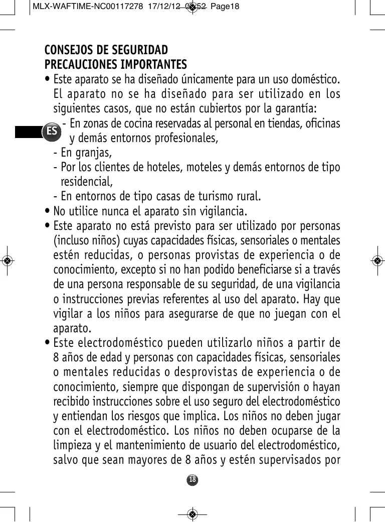 CONSEJOS DE SEGURIDAD PRECAUCIONES IMPORTANTES • Este aparato se ha diseñado únicamente para un uso doméstico. El aparato no se ha diseñado para ser utilizado en los siguientes casos, que no están cubiertos por la garantía: - En zonas de cocina reservadas al personal en tiendas, oficinas ES y demás entornos profesionales, - En granjas, - Por los clientes de hoteles, moteles y demás entornos de tipo residencial, - En entornos de tipo casas de turismo rural. • No utilice nunca el aparato sin vigilancia. • Este aparato no está previsto para ser utilizado por personas (incluso niños) cuyas capacidades físicas, sensoriales o mentales estén reducidas, o personas provistas de experiencia o de conocimiento, excepto si no han podido beneficiarse si a través de una persona responsable de su seguridad, de una vigilancia o instrucciones previas referentes al uso del aparato. Hay que vigilar a los niños para asegurarse de que no juegan con el aparato. • Este electrodoméstico pueden utilizarlo niños a partir de 8 años de edad y personas con capacidades físicas, sensoriales o mentales reducidas o desprovistas de experiencia o de conocimiento, siempre que dispongan de supervisión o hayan recibido instrucciones sobre el uso seguro del electrodoméstico y entiendan los riesgos que implica. Los niños no deben jugar con el electrodoméstico. Los niños no deben ocuparse de la limpieza y el mantenimiento de usuario del electrodoméstico, salvo que sean mayores de 8 años y estén supervisados por 18