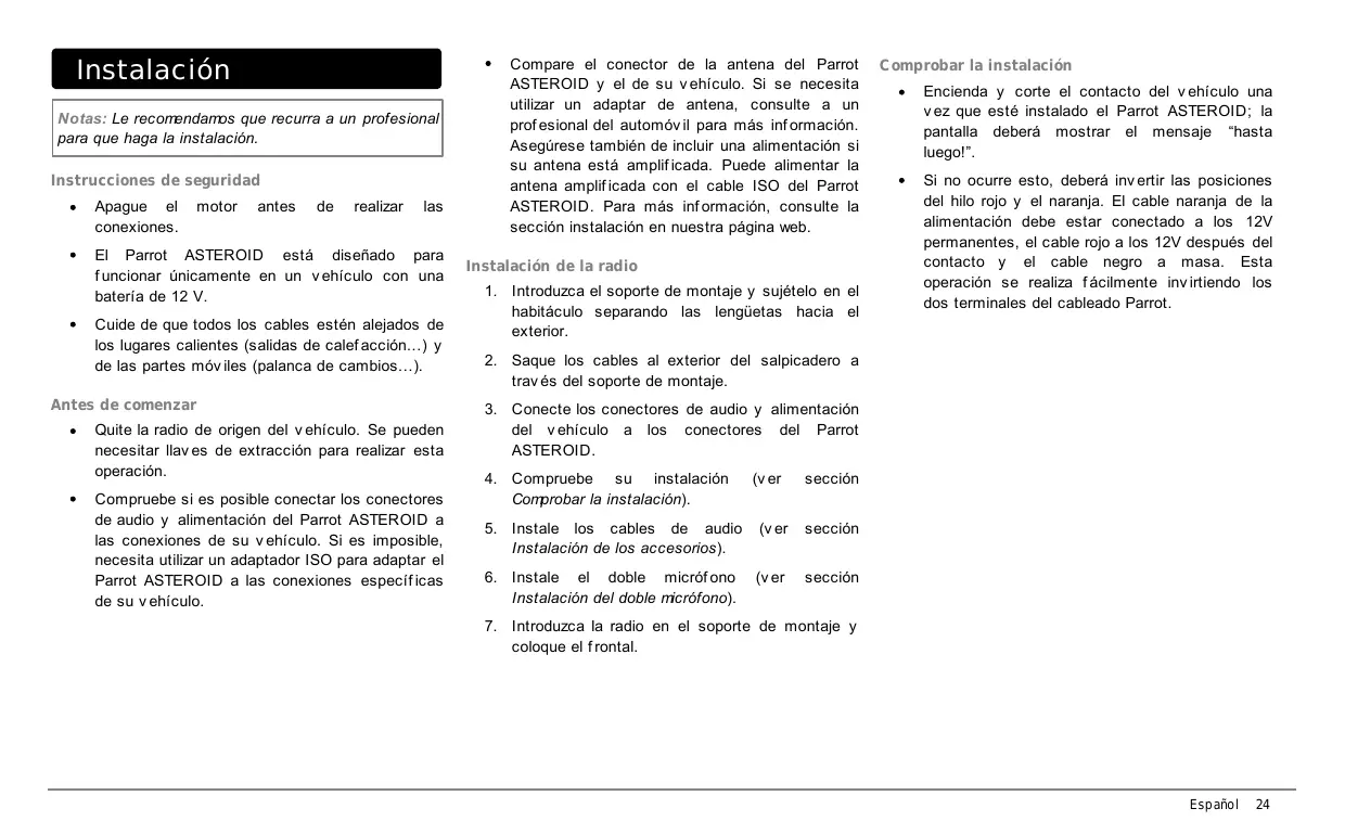 realizar las El Parrot ASTEROID está diseñado para f uncionar únicamente en un v ehículo con una batería de 12 V. Cuide de que todos los cables estén alejados de los lugares calientes (salidas de calef acción...) y de las partes móv iles (palanca de cambios...). Antes de comenzar Quite la radio de origen del v ehículo. Se pueden necesitar llav es de extracción para realizar esta operación. Compruebe si es posible conectar los conectores de audio y alimentación del Parrot ASTEROID a las conexiones de su v ehículo. Si es imposible, necesita utilizar un adaptador ISO para adaptar el Parrot ASTEROID a las conexiones específ icas de su v ehículo. Compare el conector de la antena del Parrot ASTEROID y el de su v ehículo. Si se necesita utilizar un adaptar de antena, consulte a un prof esional del automóv il para más inf ormación. Asegúrese también de incluir una alimentación si su antena está amplif icada. Puede alimentar la antena amplif icada con el cable ISO del Parrot ASTEROID. Para más inf ormación, consulte la sección instalación en nuestra página web. Instalación de la radio