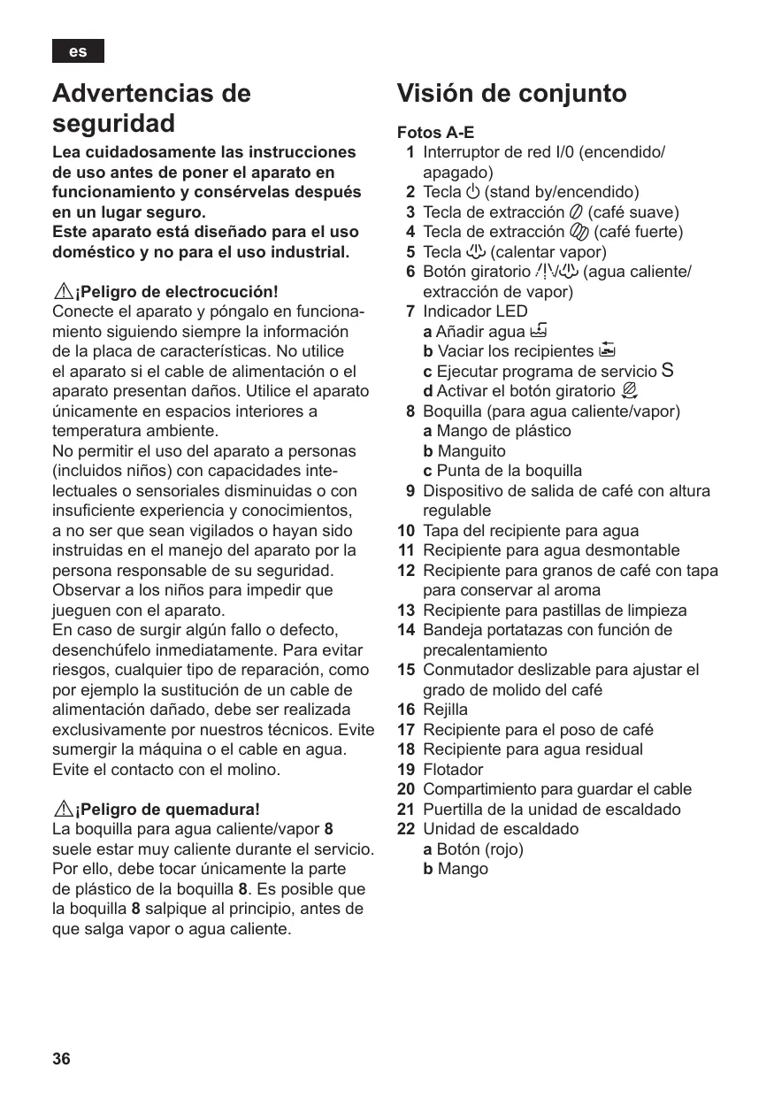 Visión de conjunto Fotos A-E 1 Interruptor de red I/0 (encendido/ apagado) 2 Tecla a (stand by/encendido) 3 Tecla de extracción 5 (café suave) 4 Tecla de extracción K (café fuerte) 5 Tecla h (calentar vapor) 6 Botón giratorio g/h (agua caliente/ extracción de vapor) 7 Indicador LED a Añadir agua H b Vaciar los recipientes I c Ejecutar programa de servicio S d Activar el botón giratorio J 8 Boquilla (para agua caliente/vapor) a Mango de plástico b Manguito c Punta de la boquilla 9 Dispositivo de salida de café con altura regulable 10 Tapa del recipiente para agua 11 Recipiente para agua desmontable 12 Recipiente para granos de café con tapa para conservar al aroma 13 Recipiente para pastillas de limpieza 14 Bandeja portatazas con función de precalentamiento 15 Conmutador deslizable para ajustar el grado de molido del café 16 Rejilla 17 Recipiente para el poso de café 18 Recipiente para agua residual 19 Flotador 20 Compartimiento para guardar el cable 21 Puertilla de la unidad de escaldado 22 Unidad de escaldado a Botón (rojo) b Mango