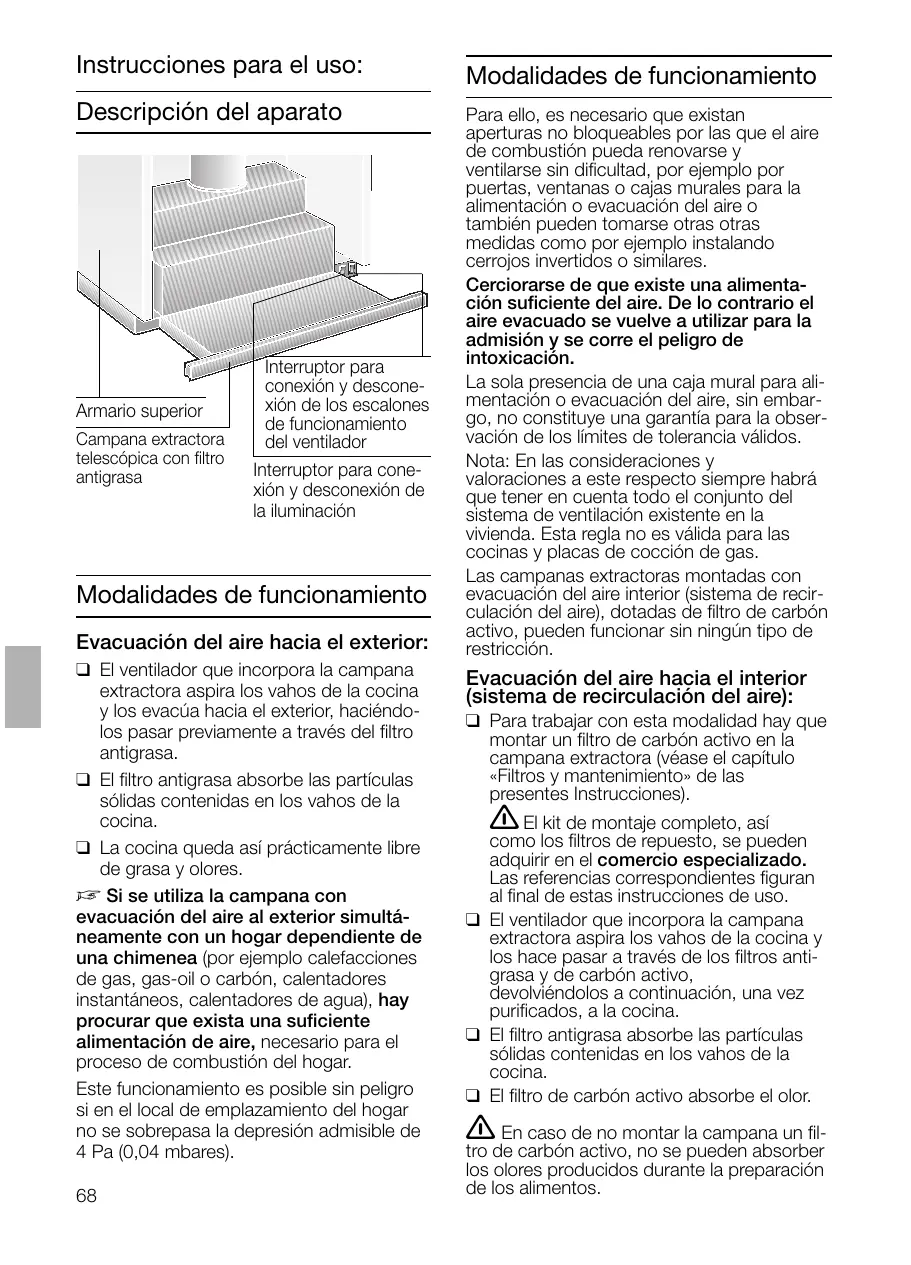 Modalidades de funcionamiento Para ello, es necesario que existan aperturas no bloqueables por las que el aire de combustión pueda renovarse y ventilarse sin dificultad, por ejemplo por puertas, ventanas o cajas murales para la alimentación o evacuación del aire o también pueden tomarse otras otras medidas como por ejemplo instalando cerrojos invertidos o similares. Cerciorarse de que existe una alimentación suficiente del aire. De lo contrario el aire evacuado se vuelve a utilizar para la admisión y se corre el peligro de intoxicación. La sola presencia de una caja mural para alimentación o evacuación del aire, sin embargo, no constituye una garantía para la observación de los límites de tolerancia válidos. Nota: En las consideraciones y valoraciones a este respecto siempre habrá que tener en cuenta todo el conjunto del sistema de ventilación existente en la vivienda. Esta regla no es válida para las cocinas y placas de cocción de gas. Las campanas extractoras montadas con evacuación del aire interior (sistema de recirculación del aire), dotadas de filtro de carbón activo, pueden funcionar sin ningún tipo de restricción. Evacuación del aire hacia el interior (sistema de recirculación del aire): ❑ Para trabajar con esta modalidad hay que montar un filtro de carbón activo en la campana extractora (véase el capítulo «Filtros y mantenimiento» de las presentes Instrucciones). 몇 El kit de montaje completo, así como los filtros de repuesto, se pueden adquirir en el comercio especializado. Las referencias correspondientes figuran al final de estas instrucciones de uso. ❑ El ventilador que incorpora la campana extractora aspira los vahos de la cocina y los hace pasar a través de los filtros antigrasa y de carbón activo, devolviéndolos a continuación, una vez purificados, a la cocina. ❑ El filtro antigrasa absorbe las partículas sólidas contenidas en los vahos de la cocina. ❑ El filtro de carbón activo absorbe el olor.