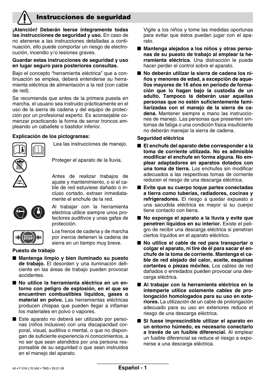 Instrucciones de seguridad ¡Atención! Deberán leerse íntegramente todas las instrucciones de seguridad y uso. En caso de no atenerse a las instrucciones detalladas a continuación, ello puede comportar un riesgo de electrocución, incendio y/o lesiones graves. Guardar estas instrucciones de seguridad y uso en lugar seguro para posteriores consultas. Bajo el concepto “herramienta eléctrica” que a continuación se emplea, deberá entenderse su herramienta eléctrica de alimentación a la red (con cable de red). Se recomienda que antes de la primera puesta en marcha, el usuario sea instruido prácticamente en el uso de la sierra de cadena y del equipo de protección por un profesional experto. Es aconsejable comenzar practicando la forma de serrar troncos empleando un caballete o bastidor inferior. Explicación de los pictogramas: Lea las instrucciones de manejo. Proteger el aparato de la lluvia. Antes de realizar trabajos de ajuste y mantenimiento, o si el cable de red estuviese dañado o incluso cortado, extraer inmediatamente el enchufe de la red. Al trabajar con la herramienta eléctrica utilice siempre unos protectores auditivos y unas gafas de protección. Los frenos de cadena y de marcha por inercia detienen la cadena de sierra en un tiempo muy breve. Puesto de trabajo ■ Mantenga limpio y bien iluminado su puesto de trabajo. El desorden y una iluminación deficiente en las áreas de trabajo pueden provocar accidentes. ■ No utilice la herramienta eléctrica en un entorno con peligro de explosión, en el que se encuentren combustibles líquidos, gases o material en polvo. Las herramientas eléctricas producen chispas que pueden llegar a inflamar los materiales en polvo o vapores. ■ Este aparato no deberá ser utilizado por personas (niños inclusive) con una discapacidad corporal, visual, auditiva o mental, o que no dispongan de suficiente experiencia ni conocimientos, a no ser que sean atendidos por una persona responsable de su seguridad o que sean instruidos en el manejo del aparato. 40 • F 016 L70 540 • TMS • 29.01.09
