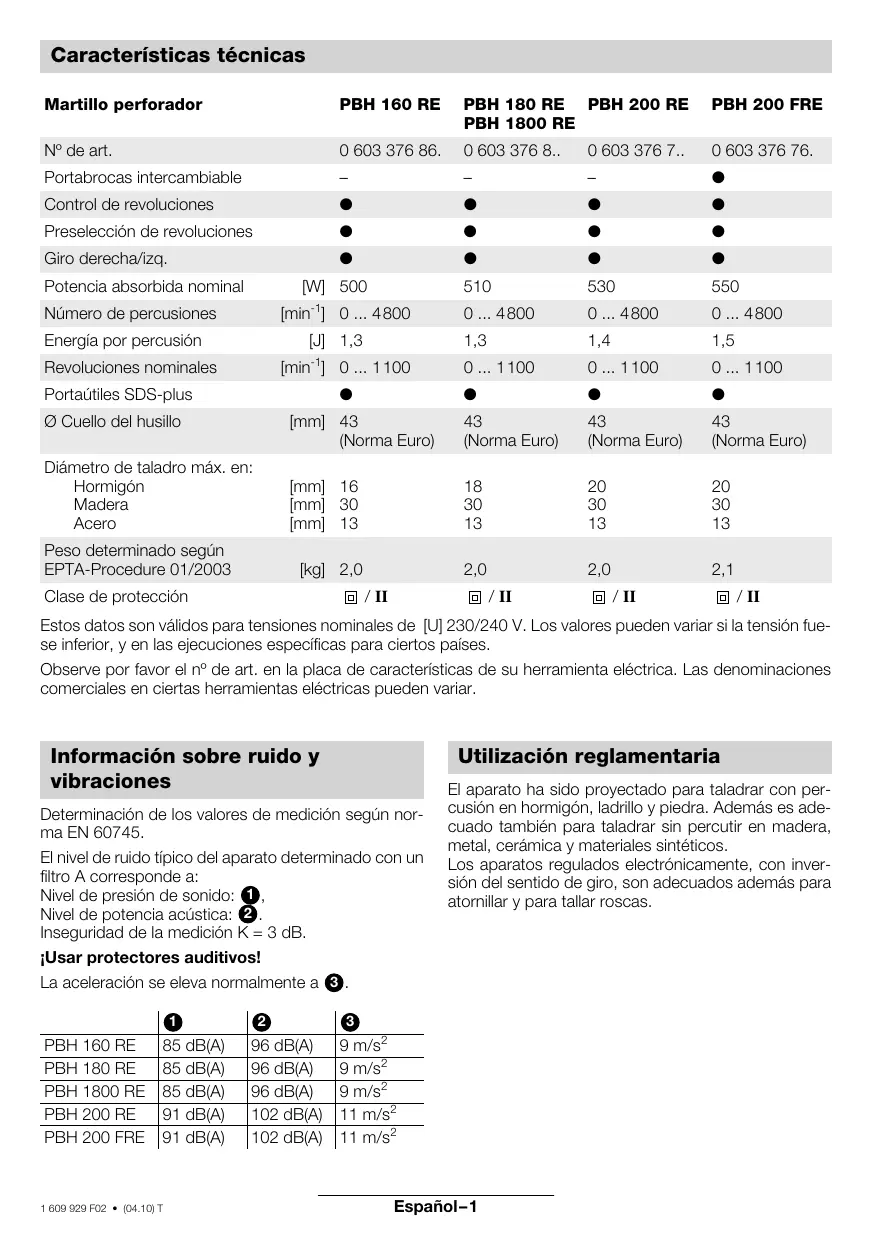 Potencia absorbida nominal [W] 500 [min-1] 0 ... 4800 Número de percusiones Energía por percusión Portaútiles SDS-plus Ø Cuello del husillo Diámetro de taladro máx. en: Hormigón Madera Acero Peso determinado según EPTA-Procedure 01/2003 [kg] 2,0 Clase de protección 2,0 / II 2,0 / II 2,1 / II / II Estos datos son válidos para tensiones nominales de [U] 230/240 V. Los valores pueden variar si la tensión fuese inferior, y en las ejecuciones específicas para ciertos países. Observe por favor el nº de art. en la placa de características de su herramienta eléctrica. Las denominaciones comerciales en ciertas herramientas eléctricas pueden variar. Información sobre ruido y vibraciones Utilización reglamentaria Determinación de los valores de medición según norma EN 60745. El nivel de ruido típico del aparato determinado con un filtro A corresponde a: Nivel de presión de sonido: 1 , Nivel de potencia acústica: 2 . Inseguridad de la medición K = 3 dB. ¡Usar protectores auditivos! La aceleración se eleva normalmente a 3 .