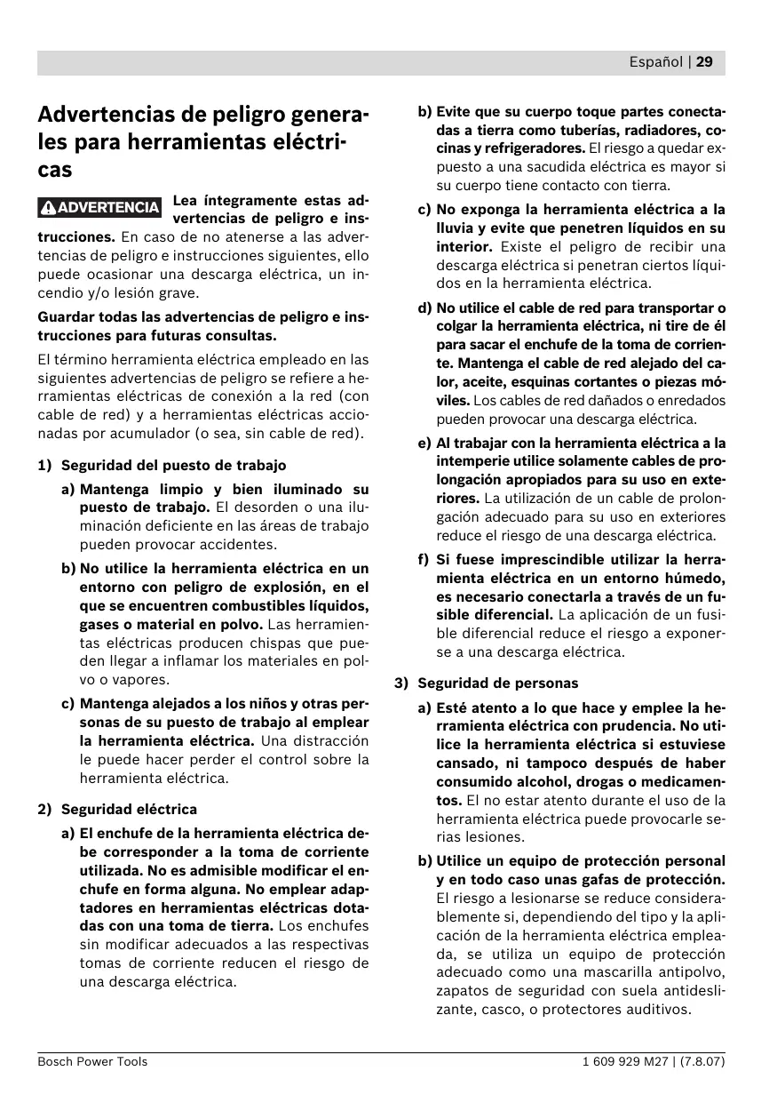 a) No sobrecargue la herramienta eléctrica. Use la herramienta eléctrica prevista para el trabajo a realizar. Con la herramienta adecuada podrá trabajar mejor y más seguro dentro del margen de potencia indicado. 1 609 929 M27 | (7.8.07) b) No utilice herramientas eléctricas con un interruptor defectuoso. Las herramientas eléctricas que no se puedan conectar o desconectar son peligrosas y deben hacerse reparar. c) Saque el enchufe de la red y/o desmonte el acumulador antes de realizar un ajuste en la herramienta eléctrica, cambiar de accesorio o al guardar la herramienta eléctrica. Esta medida preventiva reduce el riesgo a conectar accidentalmente la herramienta eléctrica. d) Guarde las herramientas eléctricas fuera del alcance de los niños. No permita la utilización de la herramienta eléctrica a aquellas personas que no estén familiarizadas con su uso o que no hayan leído estas instrucciones. Las herramientas eléctricas utilizadas por personas inexpertas son peligrosas. e) Cuide la herramienta eléctrica con esmero. Controle si funcionan correctamente, sin atascarse, las partes móviles de la herramienta eléctrica, y si existen partes rotas o deterioradas que pudieran afectar al funcionamiento de la herramienta eléctrica. Haga reparar estas piezas defectuosas antes de volver a utilizar la herramienta eléctrica. Muchos de los accidentes se deben a herramientas eléctricas con un mantenimiento deficiente. f) Mantenga los útiles limpios y afilados. Los útiles mantenidos correctamente se dejan guiar y controlar mejor. g) Utilice la herramienta eléctrica, accesorios, útiles, etc. de acuerdo a estas instrucciones, considerando en ello las condiciones de trabajo y la tarea a realizar. El uso de herramientas eléctricas para trabajos diferentes de aquellos para los que han sido concebidas puede resultar peligroso. Español | 31