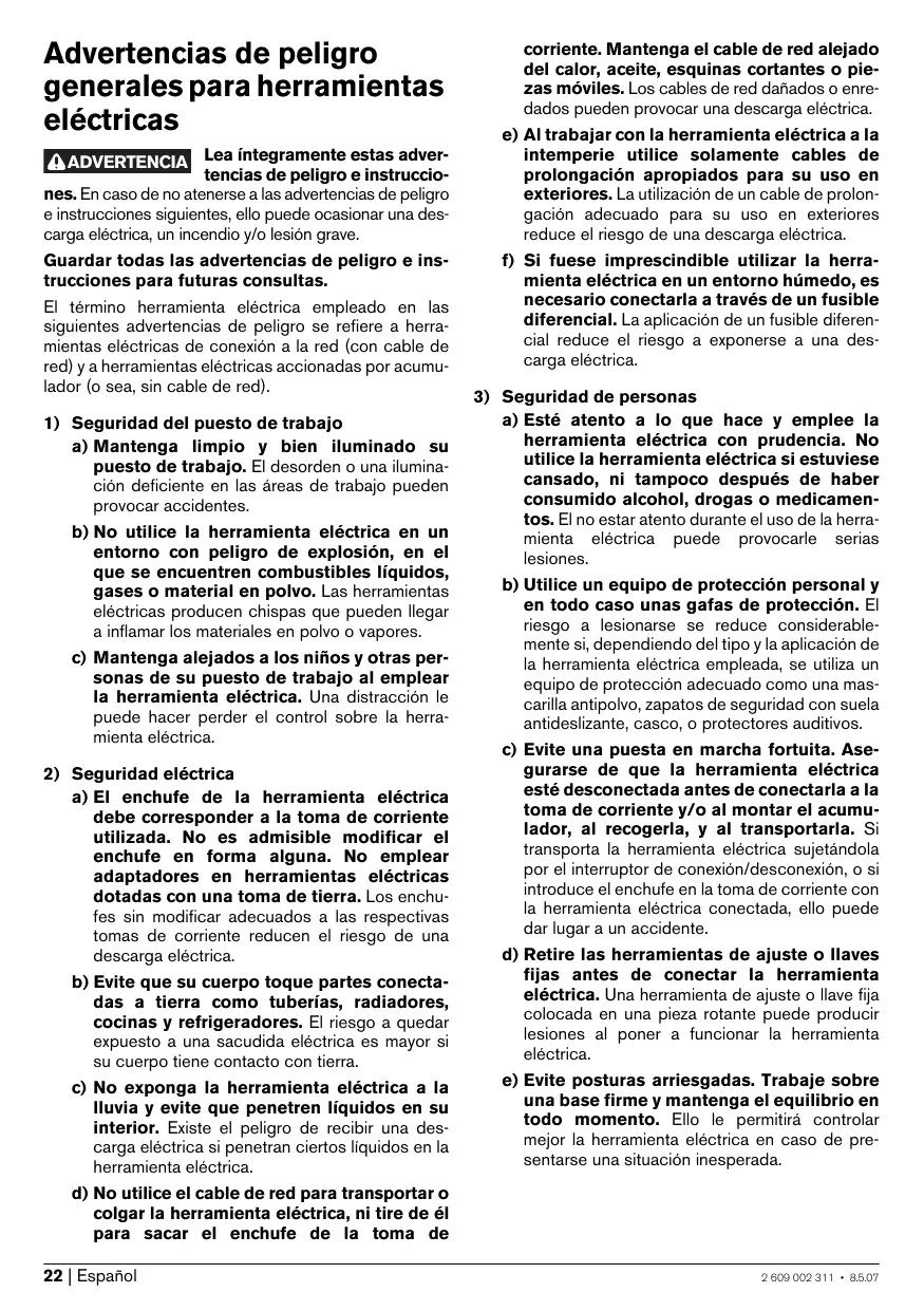 a) Esté atento a lo que hace y emplee la herramienta eléctrica con prudencia. No utilice la herramienta eléctrica si estuviese cansado, ni tampoco después de haber consumido alcohol, drogas o medicamentos. El no estar atento durante el uso de la herramienta eléctrica puede provocarle serias lesiones. b) Utilice un equipo de protección personal y en todo caso unas gafas de protección. El riesgo a lesionarse se reduce considerablemente si, dependiendo del tipo y la aplicación de la herramienta eléctrica empleada, se utiliza un equipo de protección adecuado como una mascarilla antipolvo, zapatos de seguridad con suela antideslizante, casco, o protectores auditivos. c) Evite una puesta en marcha fortuita. Asegurarse de que la herramienta eléctrica esté desconectada antes de conectarla a la toma de corriente y/o al montar el acumulador, al recogerla, y al transportarla. Si transporta la herramienta eléctrica sujetándola por el interruptor de conexión/desconexión, o si introduce el enchufe en la toma de corriente con la herramienta eléctrica conectada, ello puede dar lugar a un accidente. b) Evite que su cuerpo toque partes conectadas a tierra como tuberías, radiadores, cocinas y refrigeradores. El riesgo a quedar expuesto a una sacudida eléctrica es mayor si su cuerpo tiene contacto con tierra. d) Retire las herramientas de ajuste o llaves fijas antes de conectar la herramienta eléctrica. Una herramienta de ajuste o llave fija colocada en una pieza rotante puede producir lesiones al poner a funcionar la herramienta eléctrica. c) No exponga la herramienta eléctrica a la lluvia y evite que penetren líquidos en su interior. Existe el peligro de recibir una descarga eléctrica si penetran ciertos líquidos en la herramienta eléctrica. e) Evite posturas arriesgadas. Trabaje sobre una base firme y mantenga el equilibrio en todo momento. Ello le permitirá controlar mejor la herramienta eléctrica en caso de presentarse una situación inesperada. d) No utilice el cable de red para transportar o colgar la herramienta eléctrica, ni tire de él para sacar el enchufe de la toma de 22 | Español 2 609 002 311 • 8.5.07 f) Lleve puesta una vestimenta de trabajo adecuada. No utilice vestimenta amplia ni joyas. Mantenga su pelo, vestimenta y guantes alejados de las piezas móviles. La vestimenta suelta, el pelo largo y las joyas se pueden enganchar con las piezas en movimiento.