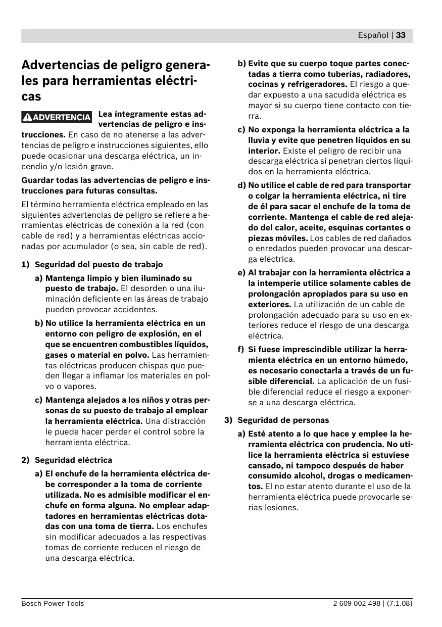 ADVERTENCIA Lea íntegramente estas advertencias de peligro e instrucciones. En caso de no atenerse a las advertencias de peligro e instrucciones siguientes, ello puede ocasionar una descarga eléctrica, un incendio y/o lesión grave. Guardar todas las advertencias de peligro e instrucciones para futuras consultas. El término herramienta eléctrica empleado en las siguientes advertencias de peligro se refiere a herramientas eléctricas de conexión a la red (con cable de red) y a herramientas eléctricas accionadas por acumulador (o sea, sin cable de red).