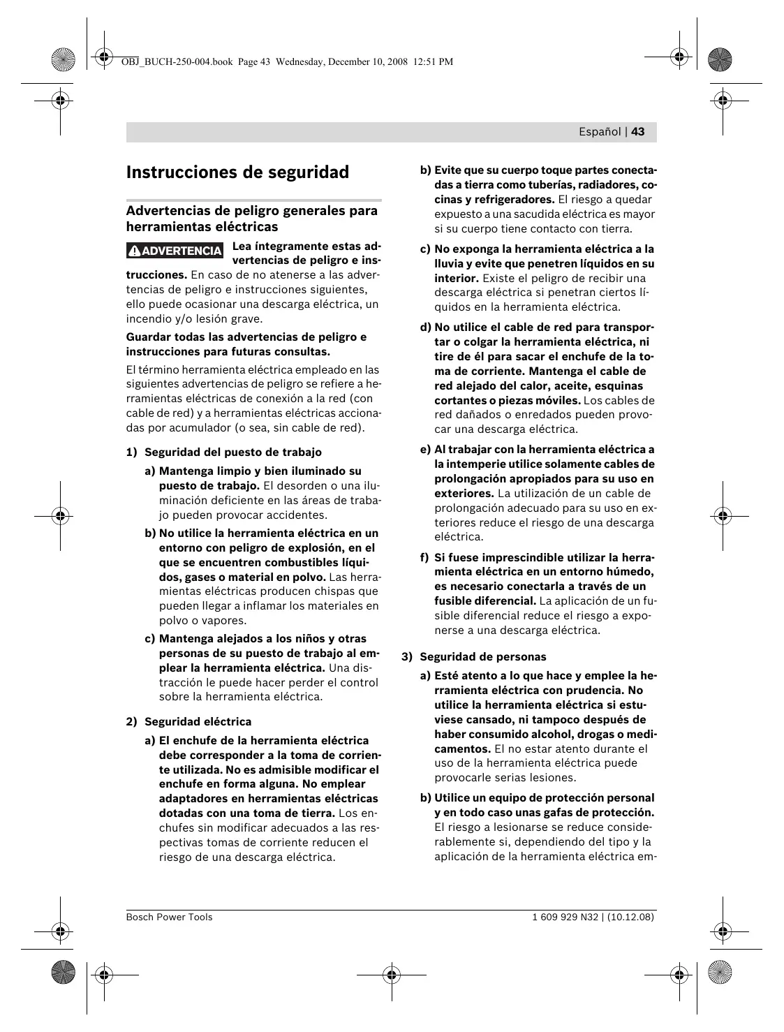 a) Esté atento a lo que hace y emplee la herramienta eléctrica con prudencia. No utilice la herramienta eléctrica si estuviese cansado, ni tampoco después de haber consumido alcohol, drogas o medicamentos. El no estar atento durante el uso de la herramienta eléctrica puede provocarle serias lesiones. b) Utilice un equipo de protección personal y en todo caso unas gafas de protección. El riesgo a lesionarse se reduce considerablemente si, dependiendo del tipo y la aplicación de la herramienta eléctrica em- 1 609 929 N32 | (10.12.08) 44 | Español pleada, se utiliza un equipo de protección adecuado como una mascarilla antipolvo, zapatos de seguridad con suela antideslizante, casco, o protectores auditivos. c) Evite una puesta en marcha fortuita. Asegurarse de que la herramienta eléctrica esté desconectada antes de conectarla a la toma de corriente y/o al montar el acumulador, al recogerla, y al transportarla. Si transporta la herramienta eléctrica sujetándola por el interruptor de conexión/desconexión, o si alimenta la herramienta eléctrica estando ésta conectada, ello puede dar lugar a un accidente. d) Retire las herramientas de ajuste o llaves fijas antes de conectar la herramienta eléctrica. Una herramienta de ajuste o llave fija colocada en una pieza rotante puede producir lesiones al poner a funcionar la herramienta eléctrica. e) Evite posturas arriesgadas. Trabaje sobre una base firme y mantenga el equilibrio en todo momento. Ello le permitirá controlar mejor la herramienta eléctrica en caso de presentarse una situación inesperada. f) Lleve puesta una vestimenta de trabajo adecuada. No utilice vestimenta amplia ni joyas. Mantenga su pelo, vestimenta y guantes alejados de las piezas móviles. La vestimenta suelta, el pelo largo y las joyas se pueden enganchar con las piezas en movimiento. g) Siempre que sea posible utilizar unos equipos de aspiración o captación de polvo, asegúrese que éstos estén montados y que sean utilizados correctamente. El empleo de estos equipos reduce los riesgos derivados del polvo.