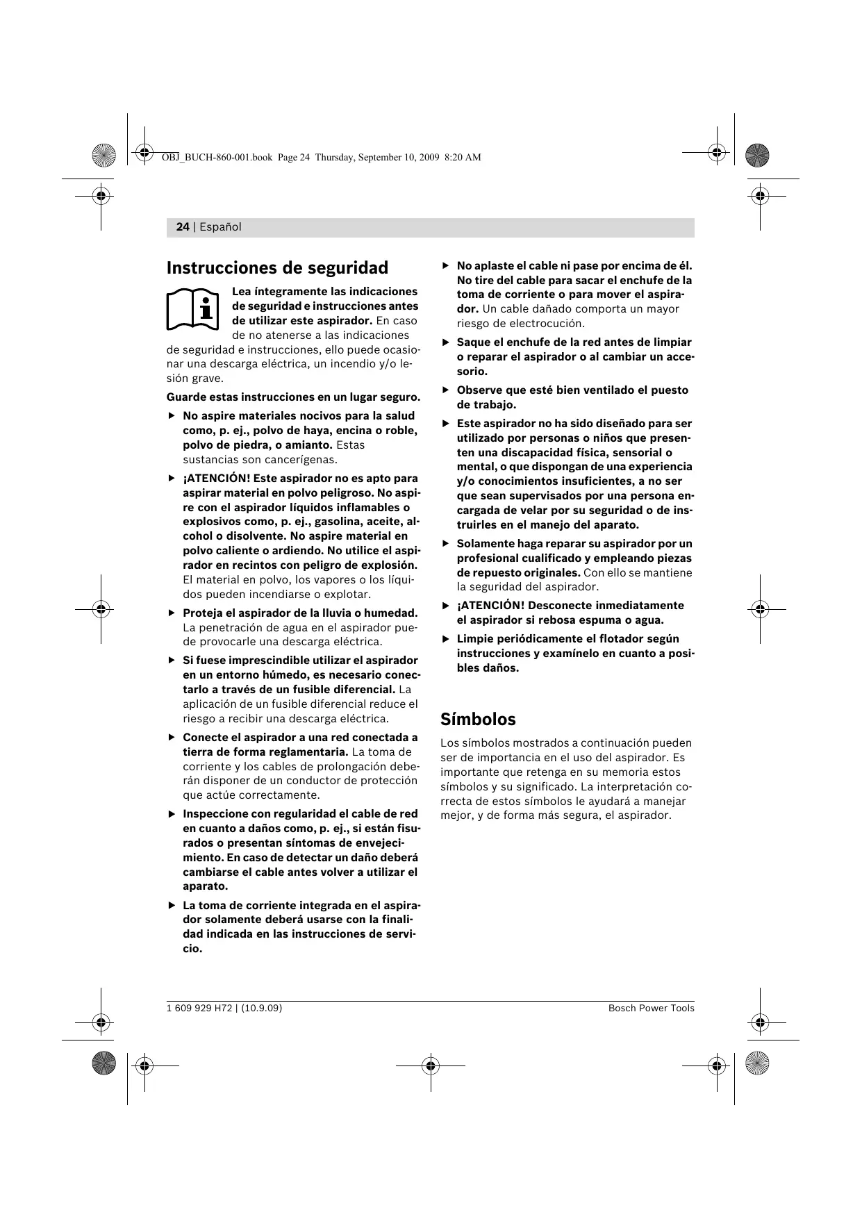 - medida en el ventilador Estos datos son válidos para tensiones nominales de [U] 230/240 V. Los valores pueden variar si la tensión fuese inferior, y en las ejecuciones específicas para ciertos países. Preste atención al nº de artículo en la placa de características de su aspirador. Las denominaciones comerciales de algunos aspiradores pueden variar. Montaje f Antes de cualquier manipulación en el aspirador extraiga el enchufe de red de la toma de corriente. Observación: Al aspirar deberá tenerse montado siempre el filtro permanente 11. Si se aspira en seco deberá montarse además el saco colector de polvo 14. Cambio/montaje del saco colector de polvo (ver figura A) – Abra los cierres 4 y retire la parte superior del aspirador 10. 1 609 929 H72 | (10.9.09) – Saque hacia atrás el saco colector de polvo 14 lleno, de la brida de conexión. Cierre la abertura del saco colector de polvo plegando hacia dentro la tapa. Retire el saco colector de polvo cerrado del aspirador. – Inserte el saco colector de polvo 14 nuevo en la brida de conexión del aspirador. Asegúrese de que el saco colector de polvo 14 asiente en toda su longitud contra la pared interior del depósito 5. Monte la parte superior del aspirador 10. – Cierre los cierres 4. Utilizando un saco colector de polvo 14 se mantiene limpio más tiempo el filtro permanente 11, se prolonga la operación con un elevado rendimiento de aspiración, y se facilita la eliminación del polvo. Bosch Power Tools Montaje de la manguera de aspiración (ver figura A) Inserte la manguera de aspiración 6 en el alojamiento 8 hasta lograr que quede retenida. Empalme firmemente ambos tubos de aspiración. Monte desde arriba el porta-accesorios 13 en el alojamiento previsto en la parte superior del aspirador 10. A continuación, inserte desde abajo el ángulo en el porta-accesorios 13 hasta enclavarlo de manera perceptible. Para desmontar el porta-accesorios 13 comprima ambas puntas del ángulo y sáquelo hacia abajo. Saque hacia arriba el porta-accesorios
