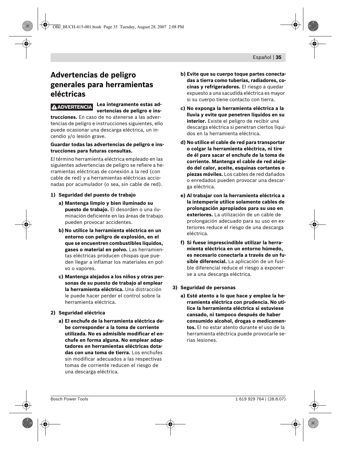 a) Esté atento a lo que hace y emplee la herramienta eléctrica con prudencia. No utilice la herramienta eléctrica si estuviese cansado, ni tampoco después de haber consumido alcohol, drogas o medicamentos. El no estar atento durante el uso de la herramienta eléctrica puede provocarle serias lesiones. 1 619 929 764 | (28.8.07) 36 | Español b) Utilice un equipo de protección personal y en todo caso unas gafas de protección. El riesgo a lesionarse se reduce considerablemente si, dependiendo del tipo y la aplicación de la herramienta eléctrica empleada, se utiliza un equipo de protección adecuado como una mascarilla antipolvo, zapatos de seguridad con suela antideslizante, casco, o protectores auditivos. c) Evite una puesta en marcha fortuita. Asegurarse de que la herramienta eléctrica esté desconectada antes de conectarla a la toma de corriente y/o al montar el acumulador, al recogerla, y al transportarla. Si transporta la herramienta eléctrica sujetándola por el interruptor de conexión/ desconexión, o si introduce el enchufe en la toma de corriente con la herramienta eléctrica conectada, ello puede dar lugar a un accidente. d) Retire las herramientas de ajuste o llaves fijas antes de conectar la herramienta eléctrica. Una herramienta de ajuste o llave fija colocada en una pieza rotante puede producir lesiones al poner a funcionar la herramienta eléctrica. e) Evite posturas arriesgadas. Trabaje sobre una base firme y mantenga el equilibrio en todo momento. Ello le permitirá controlar mejor la herramienta eléctrica en caso de presentarse una situación inesperada. f) Lleve puesta una vestimenta de trabajo adecuada. No utilice vestimenta amplia ni joyas. Mantenga su pelo, vestimenta y guantes alejados de las piezas móviles. La vestimenta suelta, el pelo largo y las joyas se pueden enganchar con las piezas en movimiento. g) Siempre que sea posible utilizar unos equipos de aspiración o captación de polvo, asegúrese que éstos estén montados y que sean utilizados correctamente. El empleo de estos equipos reduce los riesgos derivados del polvo. 1 619 929 764 | (28.8.07)