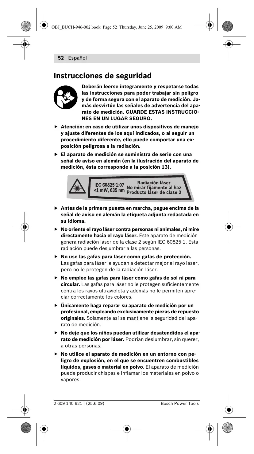 f Antes de la primera puesta en marcha, pegue encima de la señal de aviso en alemán la etiqueta adjunta redactada en su idioma. f No oriente el rayo láser contra personas ni animales, ni mire directamente hacia el rayo láser. Este aparato de medición genera radiación láser de la clase 2 según IEC 60825-1. Esta radiación puede deslumbrar a las personas. f No use las gafas para láser como gafas de protección.