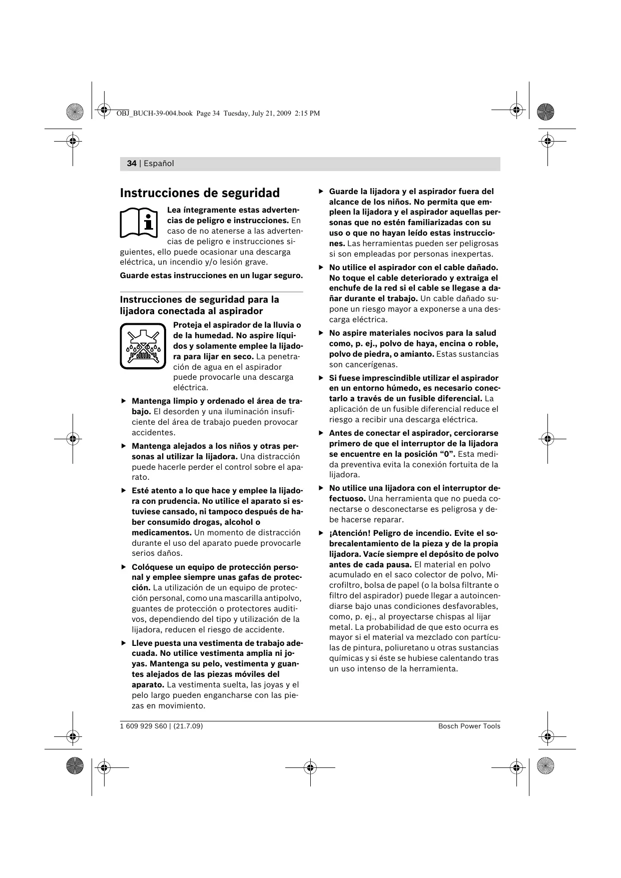 iAtencion! Peligro de incendio. Evite el sobrecalentamento de la pieza y de la propia lijadora. Vacie siempre el deposito de polvo antes de cada pusa. El material en polvo acumulado en el saco colector de polvo, Microfiltro, Bolsa de papel (o la Bolsa filtrante o filtro del aspirador) puedaURTAR a autoincendiarse bajounas conditiones desfavorables, como, p. ej., al proyectarse chispas al lijar metal. La probabilitad de que this occurra es mayor si el material va mezclo con particulas de pintura, poliuretano u otheras sustancias quimicas y si este se hubiese calentando tras un uso intenso de la herramipta.