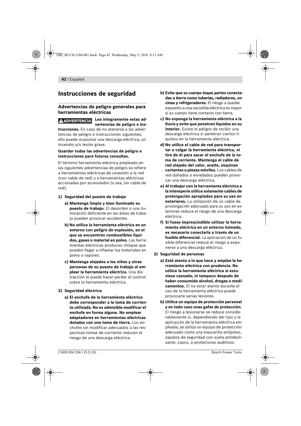 3) Seguridad de personas a) Esté atento a lo que hace y emplee la herramienta eléctrica con prudencia. No utilice la herramienta eléctrica si estuviese cansado, ni tampoco después de haber consumido alcohol, drogas o medicamentos. El no estar atento durante el uso de la herramienta eléctrica puede provocarle serias lesiones. b) Utilice un equipo de protección personal y en todo caso unas gafas de protección. El riesgo a lesionarse se reduce considerablemente si, dependiendo del tipo y la aplicación de la herramienta eléctrica empleada, se utiliza un equipo de protección adecuado como una mascarilla antipolvo, zapatos de seguridad con suela antideslizante, casco, o protectores auditivos. Bosch Power Tools