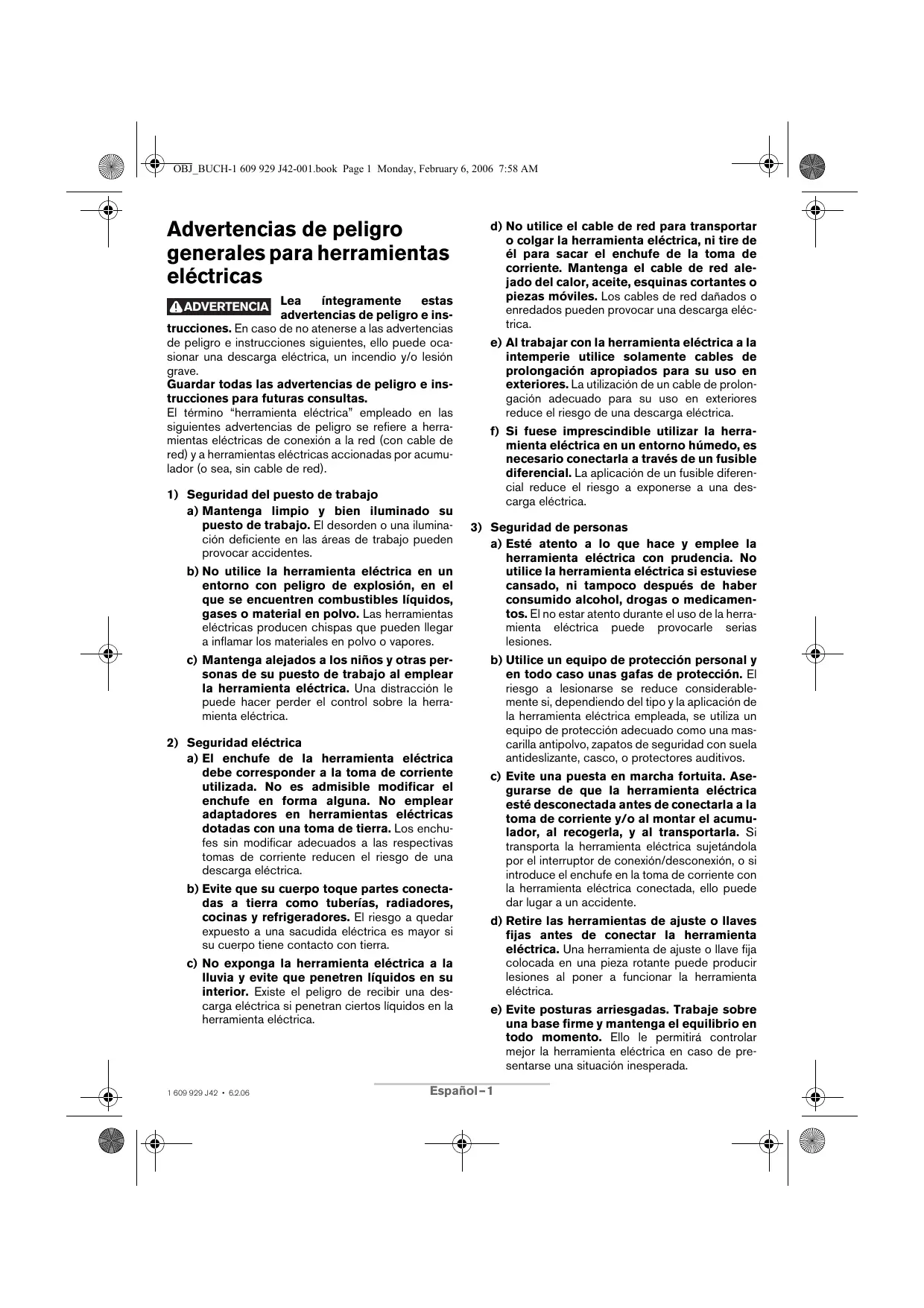a) El enchufe de la herramienta eléctrica debe corresponder a la toma de corriente utilizada. No es admisible modificar el enchufe en forma alguna. No emplear adaptadores en herramientas eléctricas dotadas con una toma de tierra. Los enchufes sin modificar adecuados a las respectivas tomas de corriente reducen el riesgo de una descarga eléctrica. b) Evite que su cuerpo toque partes conectadas a tierra como tuberías, radiadores, cocinas y refrigeradores. El riesgo a quedar expuesto a una sacudida eléctrica es mayor si su cuerpo tiene contacto con tierra. c) No exponga la herramienta eléctrica a la lluvia y evite que penetren líquidos en su interior. Existe el peligro de recibir una descarga eléctrica si penetran ciertos líquidos en la herramienta eléctrica. 1 609 929 J42 • 6.2.06 d) No utilice el cable de red para transportar o colgar la herramienta eléctrica, ni tire de él para sacar el enchufe de la toma de corriente. Mantenga el cable de red alejado del calor, aceite, esquinas cortantes o piezas móviles. Los cables de red dañados o enredados pueden provocar una descarga eléctrica. e) Al trabajar con la herramienta eléctrica a la intemperie utilice solamente cables de prolongación apropiados para su uso en exteriores. La utilización de un cable de prolongación adecuado para su uso en exteriores reduce el riesgo de una descarga eléctrica. f) Si fuese imprescindible utilizar la herramienta eléctrica en un entorno húmedo, es necesario conectarla a través de un fusible diferencial. La aplicación de un fusible diferencial reduce el riesgo a exponerse a una descarga eléctrica.