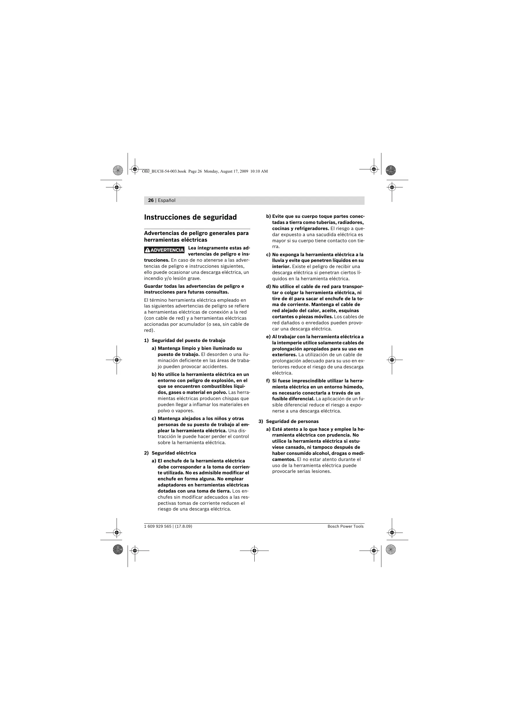 eléctricas a) No sobrecargue la herramienta eléctrica. Use la herramienta eléctrica prevista para el trabajo a realizar. Con la herramienta adecuada podrá trabajar mejor y más seguro dentro del margen de potencia indicado. b) No utilice herramientas eléctricas con un interruptor defectuoso. Las herramientas eléctricas que no se puedan conectar o desconectar son peligrosas y deben hacerse reparar. c) Saque el enchufe de la red y/o desmonte el acumulador antes de realizar un ajuste en la herramienta eléctrica, cambiar de accesorio o al guardar la herramienta eléctrica. Esta medida preventiva reduce el riesgo a conectar accidentalmente la herramienta eléctrica. d) Guarde las herramientas eléctricas fuera del alcance de los niños. No permita la utilización de la herramienta eléctrica a aquellas personas que no estén familiarizadas con su uso o que no hayan leído estas instrucciones. Las herramientas eléctricas utilizadas por personas inexpertas son peligrosas. e) Cuide la herramienta eléctrica con esmero. Controle si funcionan correctamente, sin atascarse, las partes móviles de la herramienta eléctrica, y si existen partes rotas o deterioradas que pudieran afectar al funcionamiento de la herramienta eléctrica. Haga reparar estas piezas defectuosas antes de volver a utilizar la herramienta eléctrica. Muchos de los accidentes se deben a herramientas eléctricas con un mantenimiento deficiente. f) Mantenga los útiles limpios y afilados. Los útiles mantenidos correctamente se dejan guiar y controlar mejor. 1 609 929 S65 | (17.8.09) 28 | Español g) Utilice la herramienta eléctrica, accesorios, útiles, etc. de acuerdo a estas instrucciones, considerando en ello las condiciones de trabajo y la tarea a realizar. El uso de herramientas eléctricas para trabajos diferentes de aquellos para los que han sido concebidas puede resultar peligroso.