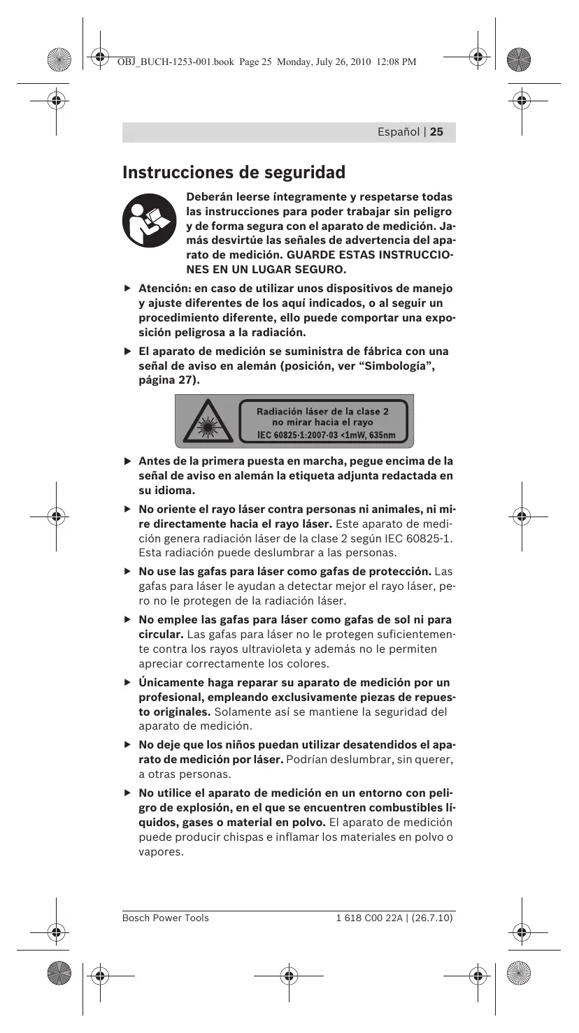 Deberán leerse íntegramente y respetarse todas las instrucciones para poder trabajar sin peligro y de forma segura con el aparato de medición. Jamás desvirtúe las señales de advertencia del aparato de medición. GUARDE ESTAS INSTRUCCIONES EN UN LUGAR SEGURO. f Atención: en caso de utilizar unos dispositivos de manejo y ajuste diferentes de los aquí indicados, o al seguir un procedimiento diferente, ello puede comportar una exposición peligrosa a la radiación. f El aparato de medición se suministra de fábrica con una señal de aviso en alemán (posición, ver “Simbología”, página 27). f Antes de la primera puesta en marcha, pegue encima de la señal de aviso en alemán la etiqueta adjunta redactada en su idioma. f No oriente el rayo láser contra personas ni animales, ni mire directamente hacia el rayo láser. Este aparato de medición genera radiación láser de la clase 2 según IEC 60825-1. Esta radiación puede deslumbrar a las personas. f No use las gafas para láser como gafas de protección. Las gafas para láser le ayudan a detectar mejor el rayo láser, pero no le protegen de la radiación láser. f No emplee las gafas para láser como gafas de sol ni para circular. Las gafas para láser no le protegen suficientemente contra los rayos ultravioleta y además no le permiten apreciar correctamente los colores. f Únicamente haga reparar su aparato de medición por un profesional, empleando exclusivamente piezas de repuesto originales. Solamente así se mantiene la seguridad del aparato de medición. f No deje que los niños puedan utilizar desatendidos el aparato de medición por láser. Podrían deslumbrar, sin querer, a otras personas. f No utilice el aparato de medición en un entorno con peligro de explosión, en el que se encuentren combustibles líquidos, gases o material en polvo. El aparato de medición puede producir chispas e inflamar los materiales en polvo o vapores. Instrucciones de seguridad y operación adicionales f Se recomienda utilizar pilas alcalinas de manganeso en el aparato de medición. f Saque las pilas del aparato de medición si pretende no utilizarlo durante largo tiempo. Tras un tiempo de almacenaje prolongado, las pilas se pueden llegar a corroer y autodescargar. f Proteja el aparato de medición de la humedad y de la exposición directa al sol. f No exponga el aparato de medición ni a temperaturas extremas ni a cambios bruscos de temperatura. No lo deje, p.ej., en el coche durante un largo tiempo. Si el aparato de medición ha quedado sometido a un cambio fuerte de temperatura, antes de ponerlo en servicio, esperar primero a que se atempere. Las temperaturas extremas o los cambios bruscos de temperatura pueden afectar a la precisión del aparato de medición. f Evite las sacudidas o caídas fuertes del aparato de medición. Los daños producidos en el aparato de medición pueden afectar a la precisión de medida. En caso de haber sufrido un golpe o caída fuerte, comparar la línea del láser con una línea de referencia horizontal o vertical conocida. f Al conectar el aparato de medición no oriente el rayo láser contra personas ni animales, ni mire directamente hacia el rayo láser. Nada más conectarlo, el aparato de medición emite rayos láser por la abertura de salida. f Desconecte el aparato de medición cuando vaya a transportarlo. Al desconectarlo, la unidad del péndulo se inmoviliza, evitándose así que se dañe al quedar sometida a una fuerte agitación. f No deje desatendido el aparato de medición estando conectado, y desconéctelo después de cada uso. El rayo láser podría llegar a deslumbrar a otras personas. f Siempre utilice el centro del haz del láser para marcar un punto. El tamaño del haz del láser varía con la distancia. f En el caso de presentarse sacudidas o ligeras variaciones de posición durante la operación, el aparato de medición se vuelve a nivelar automáticamente. Después de una nueva nivelación, controle la posición de la línea láser horizontal o vertical respecto a los puntos de referencia para evitar errores en la medición. 1 618 C00 22A | (26.7.10) Simbología Los símbolos siguientes le ayudarán a entender las instrucciones de servicio al leerlas. Es importante que retenga en su memoria estos símbolos y su significado. La interpretación correcta de estos símbolos le ayudará a manejar mejor, y de forma más segura, el aparato de medición. Simbología Significado Quigo: Láser de línea en cruz Posición de la señal de aviso láser Nº de artículo (10 dígitos) Lea íntegramente las indicaciones de seguridad e instrucciones No oriente el rayo láser contra personas ni animales, ni mire directamente hacia el rayo láser. Dirección de movimiento Dirección de reacción Acción siguiente a realizar Conexión Desconexión Acción prohibida Resultado correcto Alcance (radio), aprox. Precisión de nivelación Margen de autonivelación, típico Bosch Power Tools 1 618 C00 22A | (26.7.10) Significado Tiempo de nivelación, típico Temperatura de operación Temperatura de almacenamiento