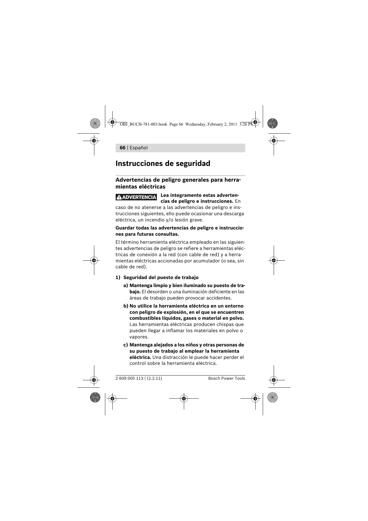 a) Mantenga limpio y bien iluminado su puesto de trabajo. El desorden o una iluminación deficiente en las áreas de trabajo pueden provocar accidentes. b) No utilice la herramienta eléctrica en un entorno con peligro de explosión, en el que se encuentren combustibles líquidos, gases o material en polvo. Las herramientas eléctricas producen chispas que pueden llegar a inflamar los materiales en polvo o vapores. c) Mantenga alejados a los niños y otras personas de su puesto de trabajo al emplear la herramienta eléctrica. Una distracción le puede hacer perder el control sobre la herramienta eléctrica. 2 609 005 113 | (2.2.11) Español | 67