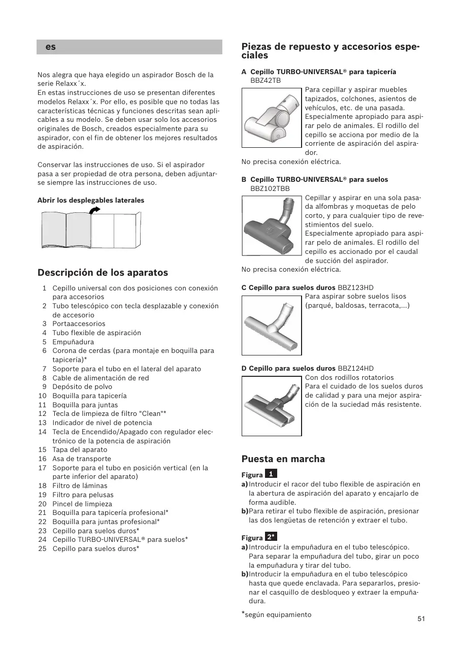 Nos alegra que haya elegido un aspirador Bosch de la serie Relaxx´x. En estas instrucciones de uso se presentan diferentes modelos Relaxx´x. Por ello, es posible que no todas las características técnicas y funciones descritas sean aplicables a su modelo. Se deben usar solo los accesorios originales de Bosch, creados especialmente para su aspirador, con el fin de obtener los mejores resultados de aspiración. Conservar las instrucciones de uso. Si el aspirador pasa a ser propiedad de otra persona, deben adjuntarse siempre las instrucciones de uso. Abrir los desplegables laterales
