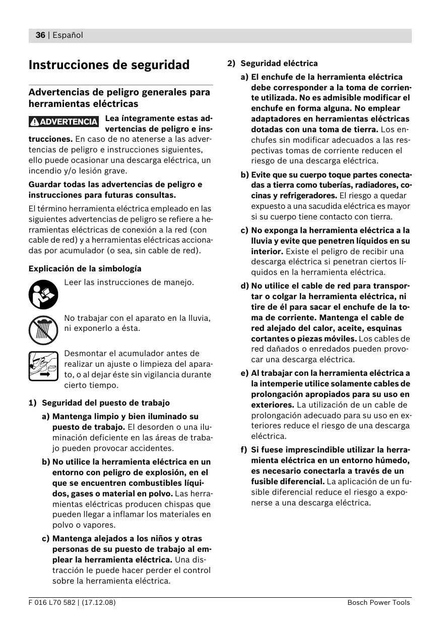 c) No exponga la herramienta电量ica a la lluvia y evite que penetrten liquidos en su interior. Existe el peligro de recibir una descarga电量ica si penetran ciertos liquidos en la herramienta电量ica.