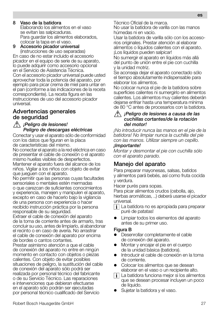Despliegue, por favor, las páginas con las ilustraciones. Figura A 1 Pie de la batidora De plástico o metal (según el modelo de aparato concreto). Montar y encajar el pie de la batidora. 2 Base motriz 3 Cable de conexión a la red eléctrica 4 Colgador Para guardar el aparato en posición suspendida. 5 Tecla de conexión a Velocidad de trabajo normal b Velocidad de trabajo «turbo» La batidora está conectada mientras se esté pulsando la tecla de conexión (a ó b). 6 Teclas de desbloqueo Pulsar simultáneamente las teclas de desbloqueo para extraer el pie del cuerpo de la batidora. 7 Pie con cuchilla Robert Bosch Hausgeräte GmbH