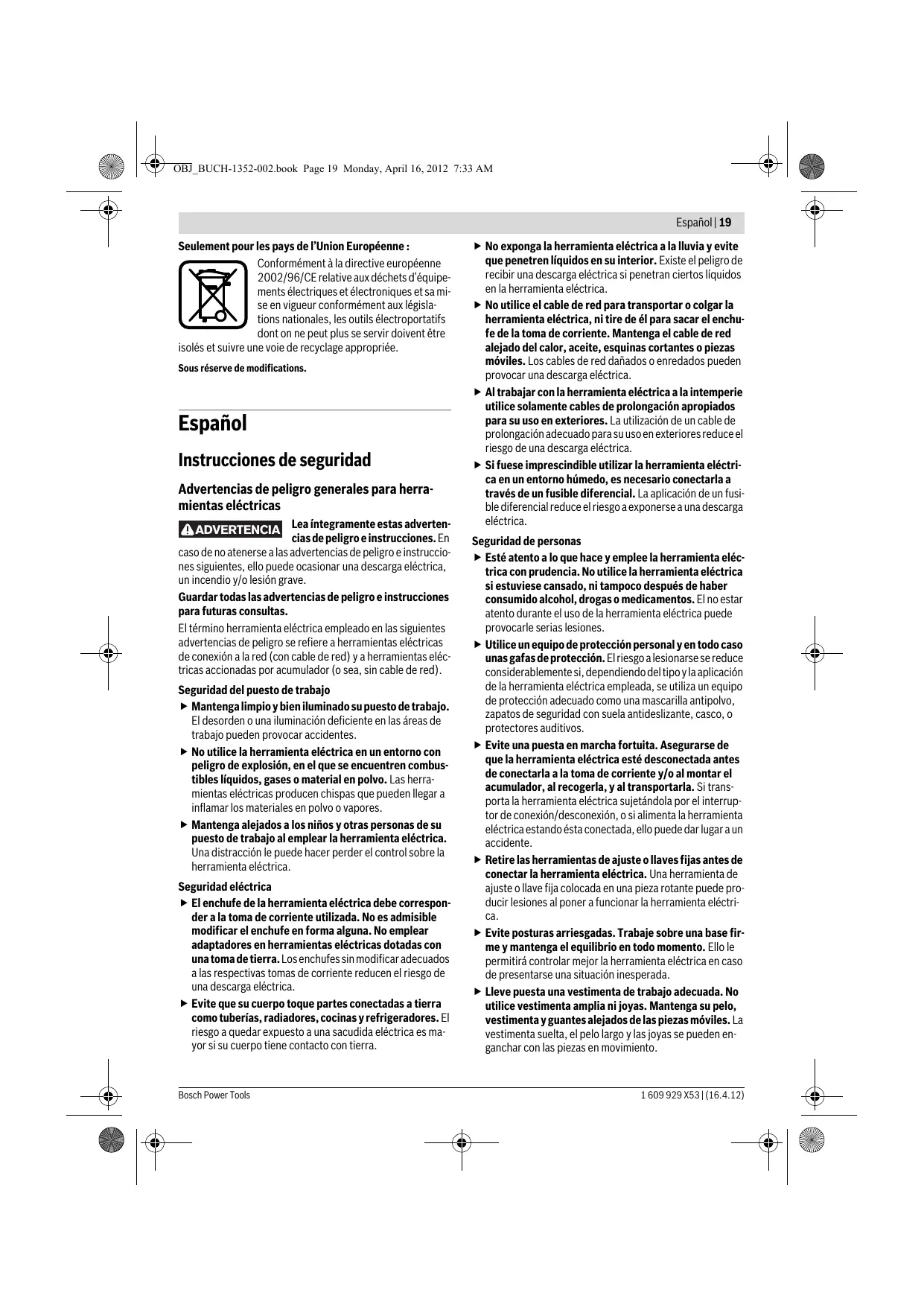 La sustitución de un cable de connexion deteriorado deben ser realizada por Bosch o por un service Tecnico autorizzato para herramrientas electricas Bosch con el fin de garantizar la seguridad del aparato.