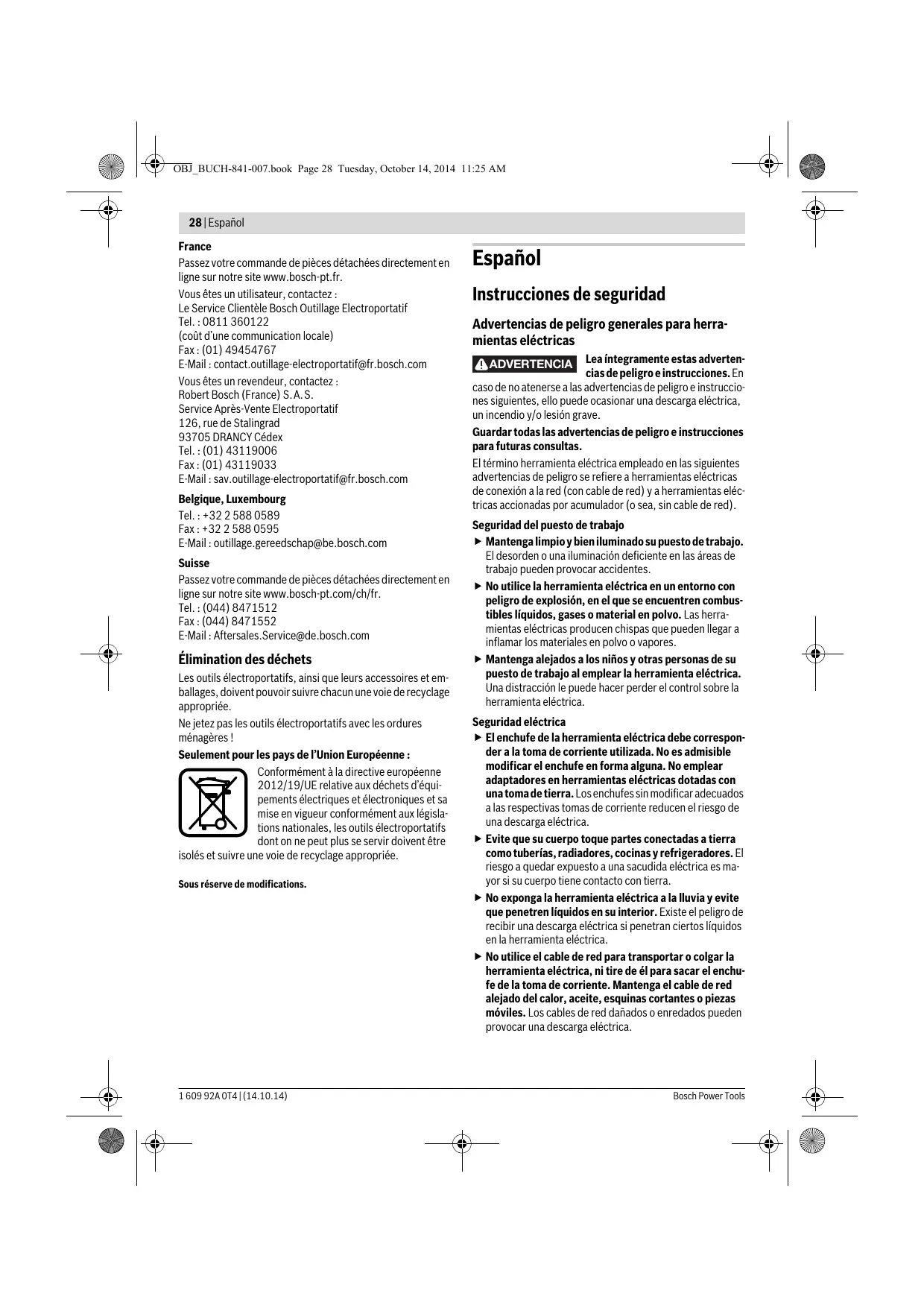 Español Instrucciones de seguridad Advertencias de peligro generales para herramientas eléctricas Lea íntegramente estas advertencias de peligro e instrucciones. En caso de no atenerse a las advertencias de peligro e instrucciones siguientes, ello puede ocasionar una descarga eléctrica, un incendio y/o lesión grave. Guardar todas las advertencias de peligro e instrucciones para futuras consultas. El término herramienta eléctrica empleado en las siguientes advertencias de peligro se refiere a herramientas eléctricas de conexión a la red (con cable de red) y a herramientas eléctricas accionadas por acumulador (o sea, sin cable de red). ADVERTENCIA Seguridad del puesto de trabajo Mantenga limpio y bien iluminado su puesto de trabajo. El desorden o una iluminación deficiente en las áreas de trabajo pueden provocar accidentes. No utilice la herramienta eléctrica en un entorno con peligro de explosión, en el que se encuentren combustibles líquidos, gases o material en polvo. Las herramientas eléctricas producen chispas que pueden llegar a inflamar los materiales en polvo o vapores. Mantenga alejados a los niños y otras personas de su puesto de trabajo al emplear la herramienta eléctrica. Una distracción le puede hacer perder el control sobre la herramienta eléctrica. Seguridad eléctrica El enchufe de la herramienta eléctrica debe corresponder a la toma de corriente utilizada. No es admisible modificar el enchufe en forma alguna. No emplear adaptadores en herramientas eléctricas dotadas con una toma de tierra. Los enchufes sin modificar adecuados a las respectivas tomas de corriente reducen el riesgo de una descarga eléctrica. Evite que su cuerpo toque partes conectadas a tierra como tuberías, radiadores, cocinas y refrigeradores. El riesgo a quedar expuesto a una sacudida eléctrica es mayor si su cuerpo tiene contacto con tierra. No exponga la herramienta eléctrica a la lluvia y evite que penetren líquidos en su interior. Existe el peligro de recibir una descarga eléctrica si penetran ciertos líquidos en la herramienta eléctrica. No utilice el cable de red para transportar o colgar la herramienta eléctrica, ni tire de él para sacar el enchufe de la toma de corriente. Mantenga el cable de red alejado del calor, aceite, esquinas cortantes o piezas móviles. Los cables de red dañados o enredados pueden provocar una descarga eléctrica. Español | 29 Al trabajar con la herramienta eléctrica a la intemperie utilice solamente cables de prolongación apropiados para su uso en exteriores. La utilización de un cable de prolongación adecuado para su uso en exteriores reduce el riesgo de una descarga eléctrica. Si fuese imprescindible utilizar la herramienta eléctrica en un entorno húmedo, es necesario conectarla a través de un fusible diferencial. La aplicación de un fusible diferencial reduce el riesgo a exponerse a una descarga eléctrica. Seguridad de personas Esté atento a lo que hace y emplee la herramienta eléctrica con prudencia. No utilice la herramienta eléctrica si estuviese cansado, ni tampoco después de haber consumido alcohol, drogas o medicamentos. El no estar atento durante el uso de la herramienta eléctrica puede provocarle serias lesiones. Utilice un equipo de protección personal y en todo caso unas gafas de protección. El riesgo a lesionarse se reduce considerablemente si, dependiendo del tipo y la aplicación de la herramienta eléctrica empleada, se utiliza un equipo de protección adecuado como una mascarilla antipolvo, zapatos de seguridad con suela antideslizante, casco, o protectores auditivos. Evite una puesta en marcha fortuita. Asegurarse de que la herramienta eléctrica esté desconectada antes de conectarla a la toma de corriente y/o al montar el acumulador, al recogerla, y al transportarla. Si transporta la herramienta eléctrica sujetándola por el interruptor de conexión/desconexión, o si alimenta la herramienta eléctrica estando ésta conectada, ello puede dar lugar a un accidente. Retire las herramientas de ajuste o llaves fijas antes de conectar la herramienta eléctrica. Una herramienta de ajuste o llave fija colocada en una pieza rotante puede producir lesiones al poner a funcionar la herramienta eléctrica. Evite posturas arriesgadas. Trabaje sobre una base firme y mantenga el equilibrio en todo momento. Ello le permitirá controlar mejor la herramienta eléctrica en caso de presentarse una situación inesperada. Lleve puesta una vestimenta de trabajo adecuada. No utilice vestimenta amplia ni joyas. Mantenga su pelo, vestimenta y guantes alejados de las piezas móviles. La vestimenta suelta, el pelo largo y las joyas se pueden enganchar con las piezas en movimiento. Siempre que sea posible utilizar unos equipos de aspiración o captación de polvo, asegúrese que éstos estén montados y que sean utilizados correctamente. El empleo de estos equipos reduce los riesgos derivados del polvo. Uso y trato cuidadoso de herramientas eléctricas No sobrecargue la herramienta eléctrica. Use la herramienta eléctrica prevista para el trabajo a realizar. Con la herramienta adecuada podrá trabajar mejor y más seguro dentro del margen de potencia indicado. No utilice herramientas eléctricas con un interruptor defectuoso. Las herramientas eléctricas que no se puedan conectar o desconectar son peligrosas y deben hacerse reparar. Saque el enchufe de la red y/o desmonte el acumulador antes de realizar un ajuste en la herramienta eléctrica, cambiar de accesorio o al guardar la herramienta eléctrica. Esta medida preventiva reduce el riesgo a conectar accidentalmente la herramienta eléctrica. Guarde las herramientas eléctricas fuera del alcance de los niños. No permita la utilización de la herramienta eléctrica a aquellas personas que no estén familiarizadas con su uso o que no hayan leído estas instrucciones. Las herramientas eléctricas utilizadas por personas inexpertas son peligrosas. Cuide la herramienta eléctrica c